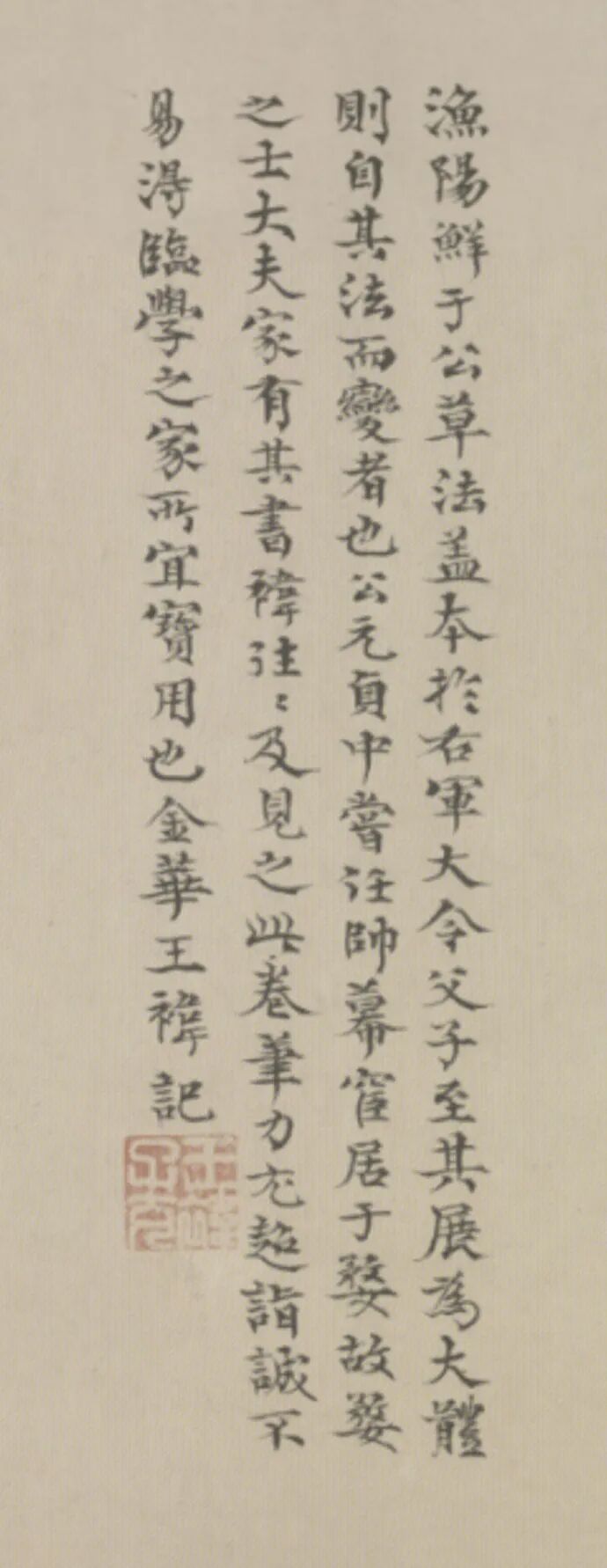 鲜于枢《草书杜甫茅屋为秋风所破歌草书卷》(日本京都藤井有邻馆藏)有鲜于去矜题跋(图5),交代甚详:先君所书,惟金华最多。而此卷又与他书不同,记其玉成先生交谊之笃,而至是也。去矜自癸卯岁(1363)来此追寻旧绪,幸得先生之从孙子约日相与过从,每见此卷,叹息不舍去手,子约当宝之。季男鲜于去矜百拜谨书,时己酉(1369)孟秋二日也。[6]