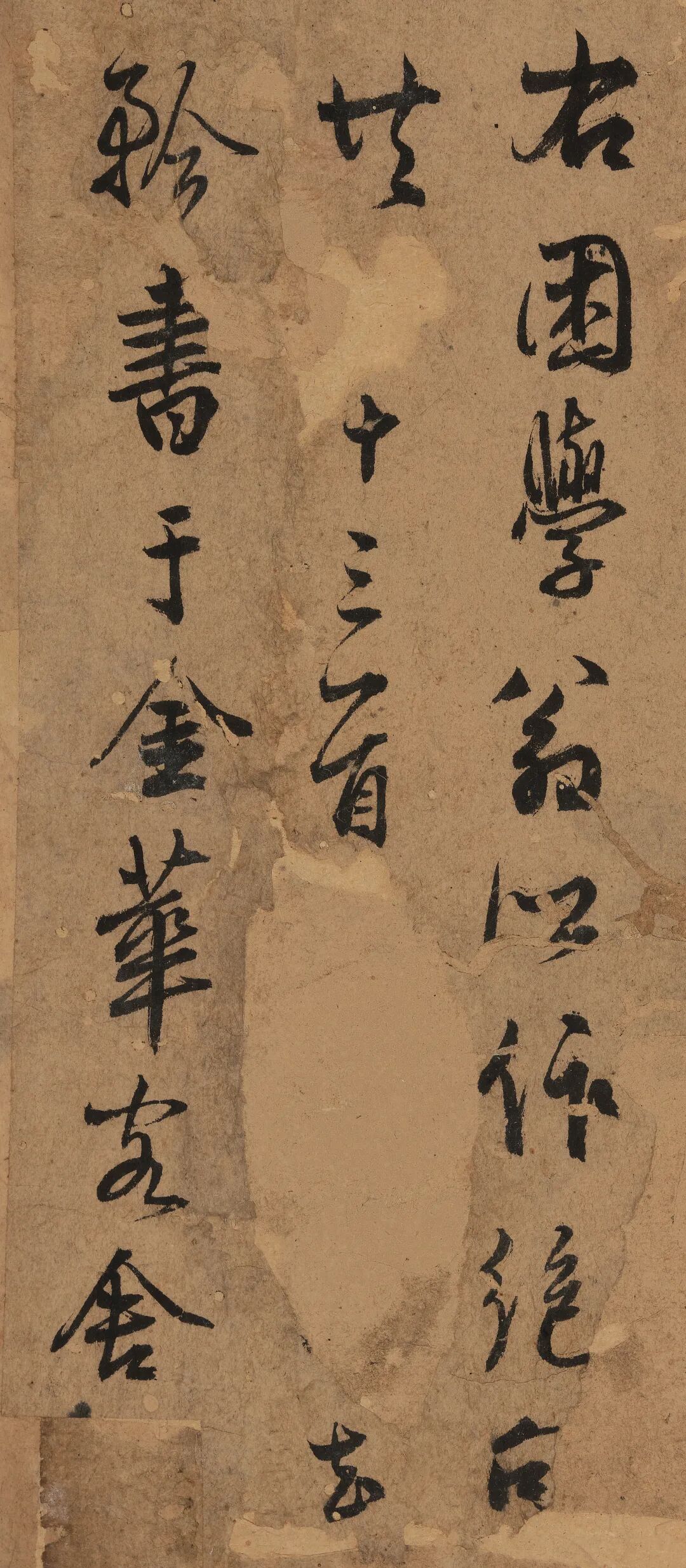 《芗头晚步》记录了他的中原之行:“山尽平川草树低,人家历历隔长溪,中原三月浑如此,雨湿桑梢陇麦齐。”《建德道中》六首,与《元诗选》二集丙集《困学斋集》中《建德溪行二首》或为一时所作,都与1298年赴建德乌龙山考察斫琴所用赤乌木有关。《夜行秀州》记录了他在嘉兴舟中经历的大风雨:“船底流澌割欲穿,船头哀夜似风颠,平生难险尝来遍,他日无忘过秀年。”第四,《草书困学斋诗册》落款“书于金华客舍”,引导我们关注鲜于枢父子与金华的特殊渊源。据戴立强《鲜于枢年谱》[3],鲜于枢于1295年春赴浙东道宣慰司任职,驻金华;1299年归自浙东(日本藏《十诗五札卷·支离叟序并诗》);1302年授太常寺典簿,未及赴任而卒。可见金华任职是在鲜于枢去世之前几年,也是他人生积累和书法创作的高峰期。“右困学翁所作绝句,共(二)十三首,(鲜于)去矜书于金华客舍。”鲜于去矜 草书困学斋诗册(局部)