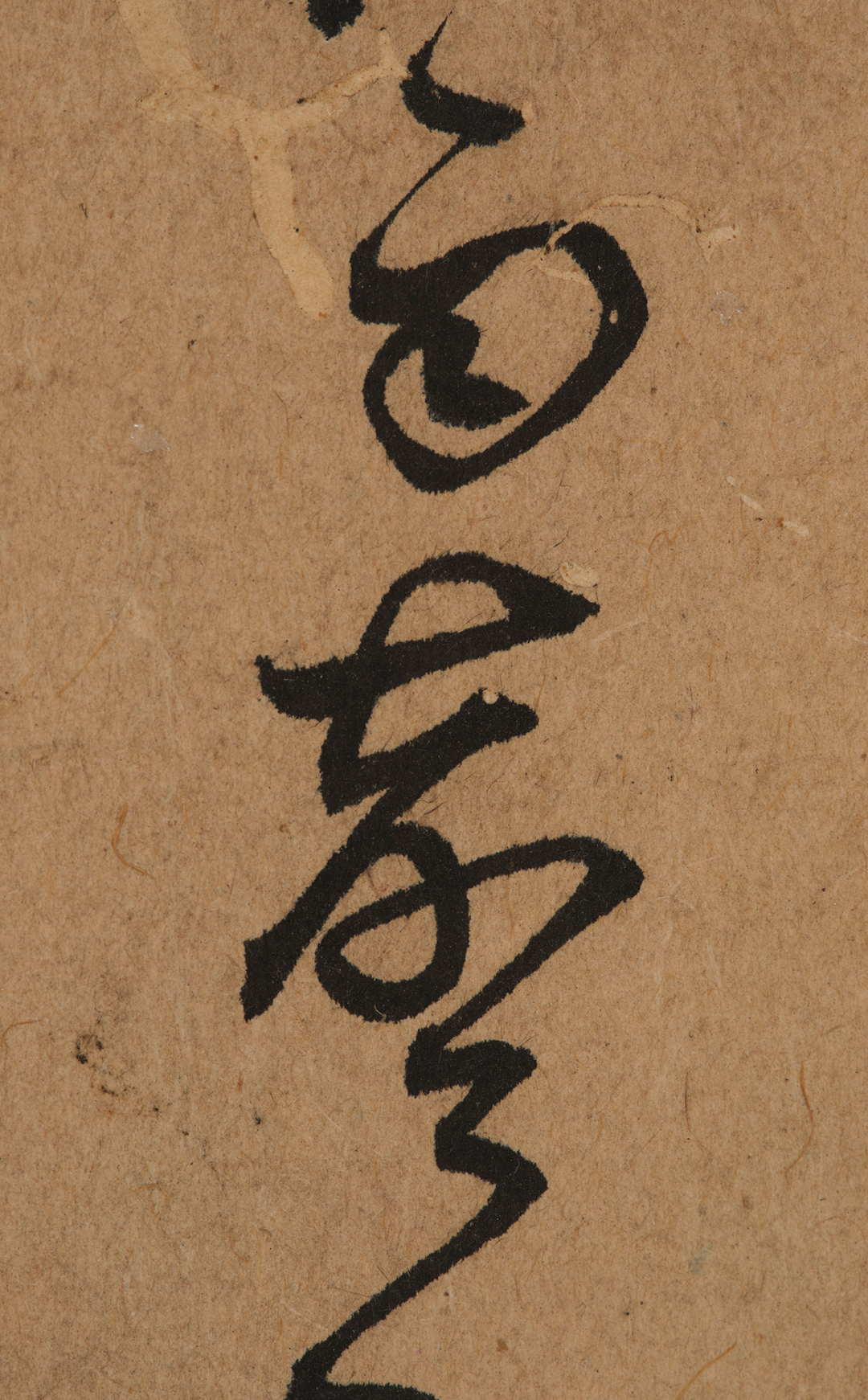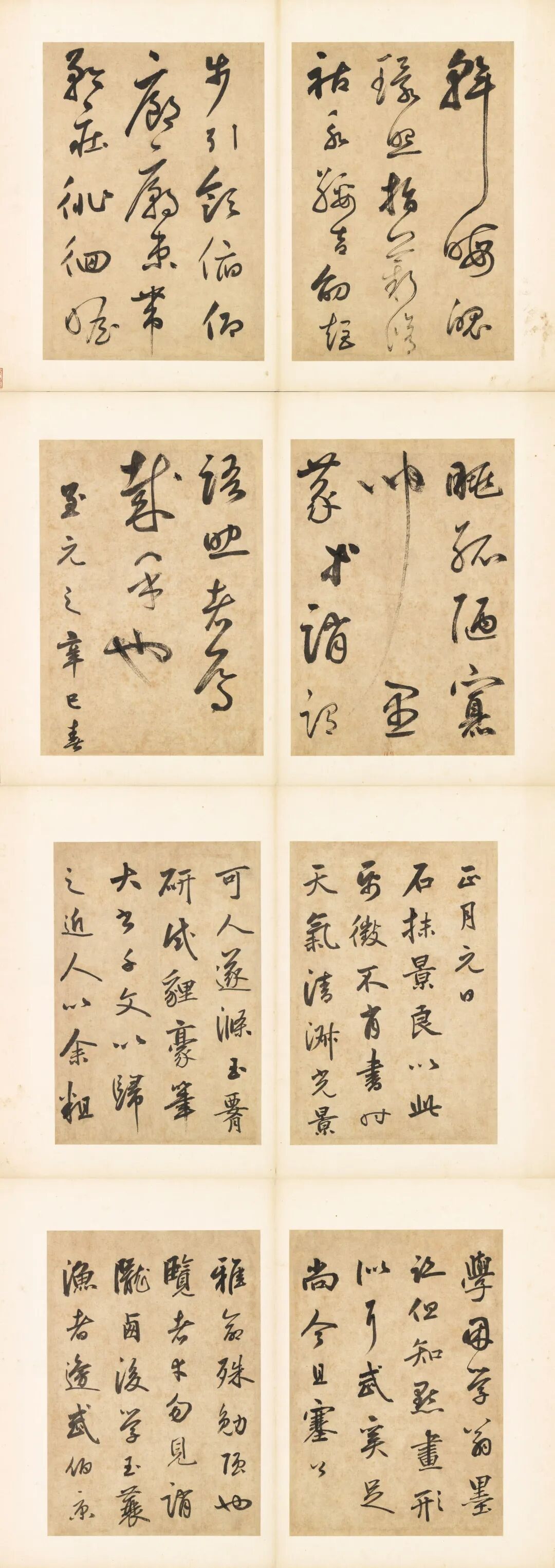 了解了这些,再来审视鲜于去矜《草书困学斋诗册》的意义,笔者认为也可归纳为四个方面:首先,《草书困学斋诗册》是鲜于去矜难得一见的独立完整的书法墨迹。鲜于去矜可见书迹有《草书李白拟古其五》(拓本),以及为鲜于枢《草书杜甫茅屋为秋风所破歌草书卷》题跋等。《草书困学斋诗册》共计24页,多达600余字,虽有局部残损,但无缺页,对一件六七百年的作品来说,可谓相当完整。每页四行,每行宽度相等,应该是折纸后书写,显示了认真和精心的态度。鲜于去矜 草书困学斋诗册(局部)