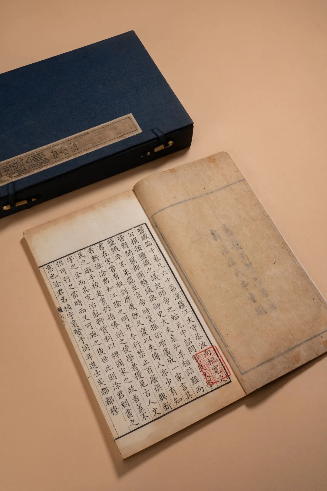 是书经清嘉庆间官员、书画家姚远之旧藏,并题跋一则“嘉庆廿有四年,岁在己卯正月廿六日右弟持赠,余以丁宝山公忧回籍,伯昂记于连枝灯馆灯下。”可知此书乃其弟赠予之物,后经近代藏家何宝善先生旧藏,名家递藏有序,钤印累累。此书刊印精美,旧装瓷青纸,书衣包角,品相极佳,为后世藏书家所宝爱。江浙各藏书大家之书,后陆续归张氏,张氏富宋元善本,所刻之书,底本珍稀。而此书不仅请顾千里代为校勘,且请江临顾虹川刻字,集众善一体。《盐铁论》有两个版本系统:一个是源自明嘉靖三十二年张氏猗兰堂刻本;另一个版本系统则以明朝弘治十四年涂祯刻本为祖本,在传世诸本中最古、最善。本品即嘉庆间张敦仁据明弘治间新淦涂氏刻本重刻,后附张敦仁考证一卷。叶德辉《郋园读书志》:“余向有此刻本,曾影写一本,以原本赠友人。后得弘治本,又思有此本一证,而十余年不一见。今幸重得,又阅沧桑,是当珍重比于明刻,不得以寻常书帕赠人之物例之也。”于晚清叶氏欲购此书而十余年未得,足见其稀见程度。