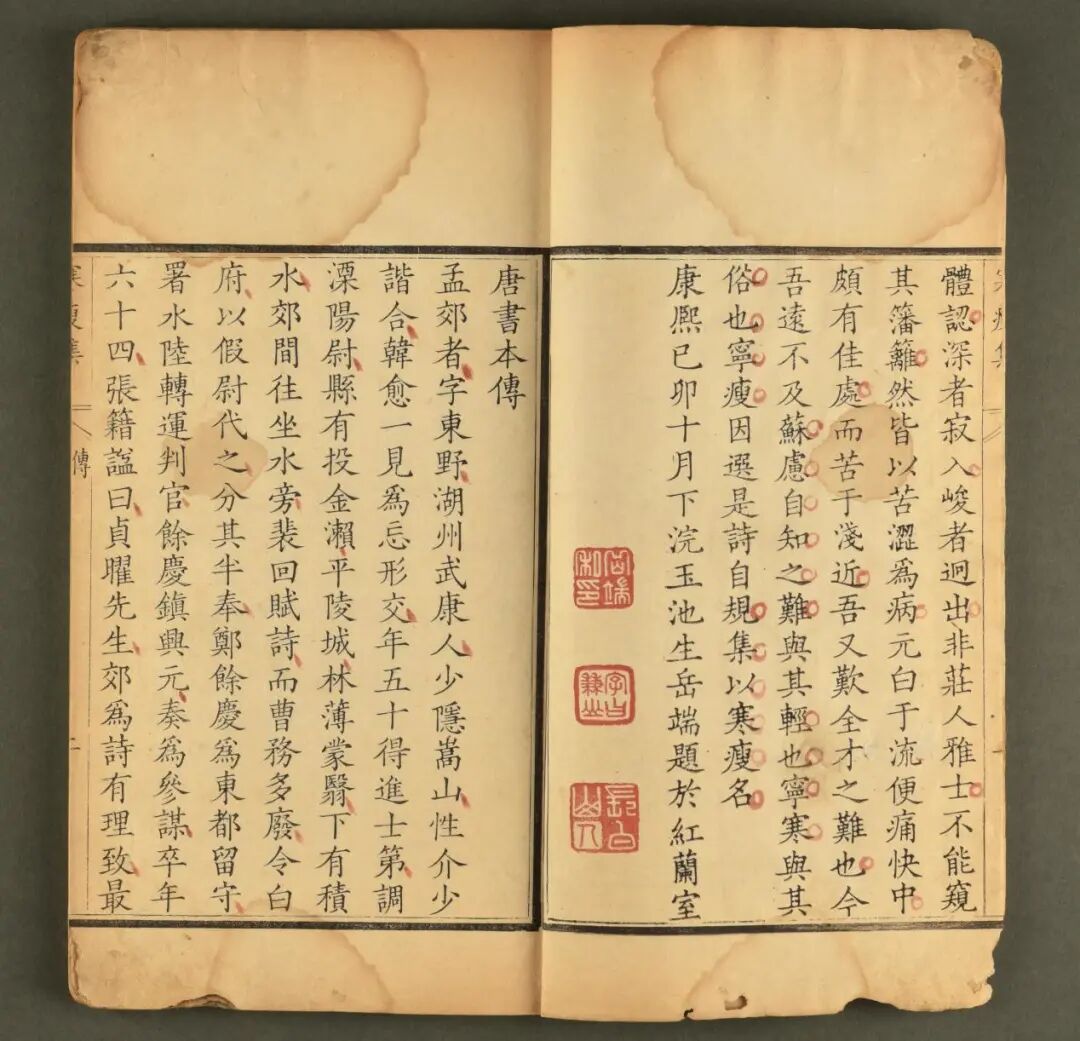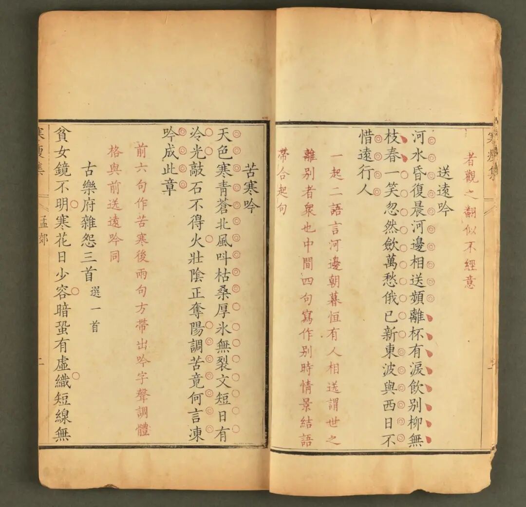 岳端(1671-1705)字正子,号玉池生、红兰室主人等,清太祖四世孙,和硕安亲王岳乐子。生平于诗、书、画、曲造诣极高,用力最勤,有《玉池生稿》、《扬州梦传奇》。此为岳端辑评唐孟郊、贾岛诗集,选诗八十二首,书中评语朱色套印,行字舒朗,通篇写刻,极精。此为岳端辑评唐孟郊、贾岛诗集,选诗八十二首,书中评语朱色套印,行字舒朗,通篇写刻,极精。此书仅此一刻,《中国古籍善本总目》着录,岳端红兰室家刻,入选《中华古籍再造善本》工程。