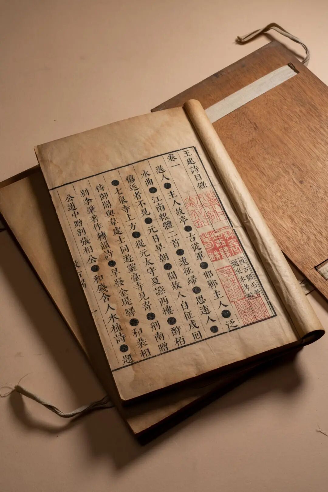 是书八卷,明崇祯汲古阁刻,卷首尾有“汲古阁毛晋据宋本考较”字样,卷尾刊有虞山毛晋题识,版心镌“汲古阁”,半页九行十九字,字体扁方,墨色匀净,朱印累累,惜有水渍。是本为毛晋据宋本考较而来,版本精审,末录苕溪渔隐凑丛话数则于八卷尾。据《中国古籍善本总目》载仅国家图书馆有藏,拍场稀见。先后经清初清文学家、藏书家顾图河,清末藏书家庄祖基,再经中国古典文献学专家王欣夫递藏,三家收藏,传承有序,版本精审,值得宝藏。