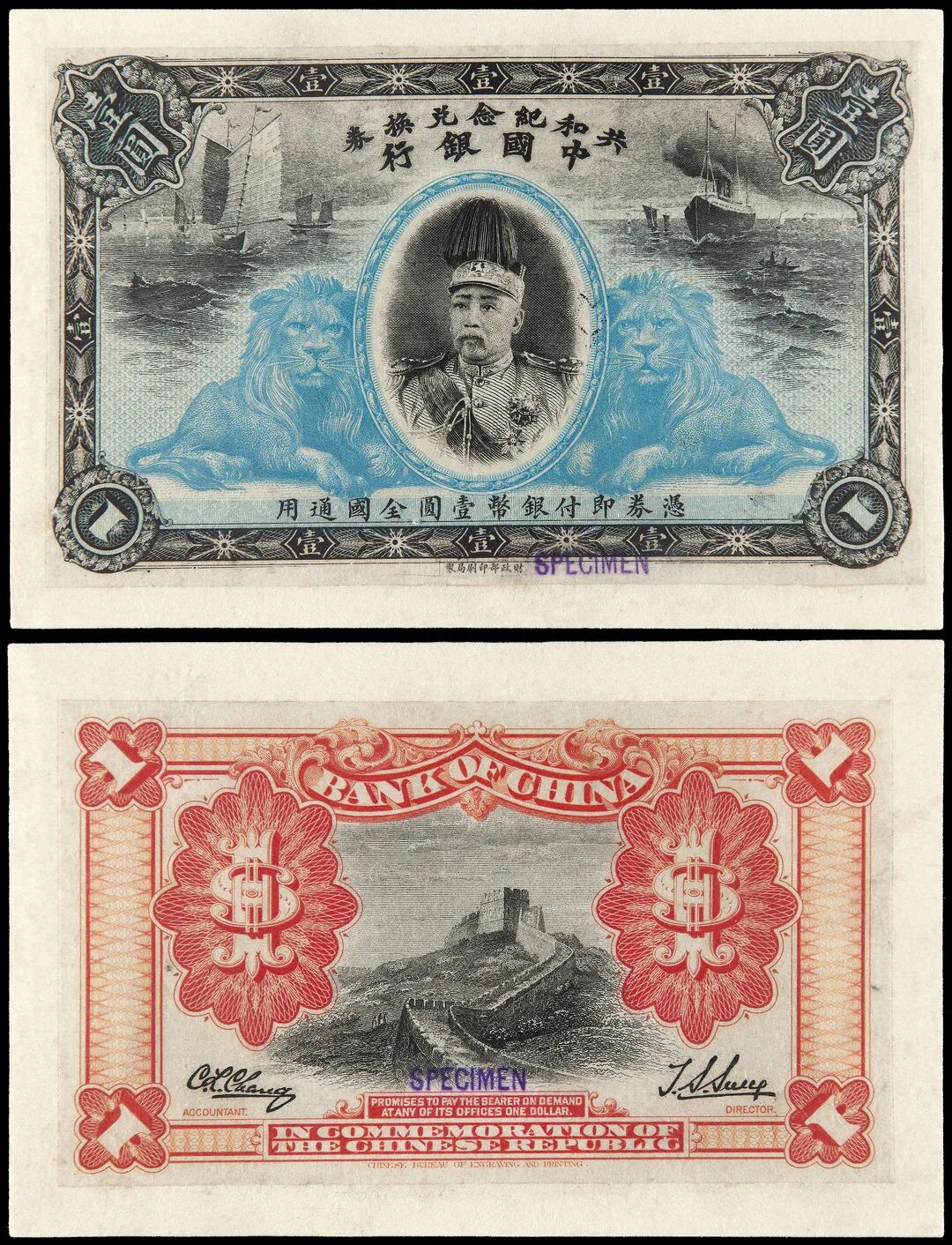 1912年中国银行袁世凯像蓝色双狮共和纪念兑换券壹圆正、反单面试印样票/均PMG评级