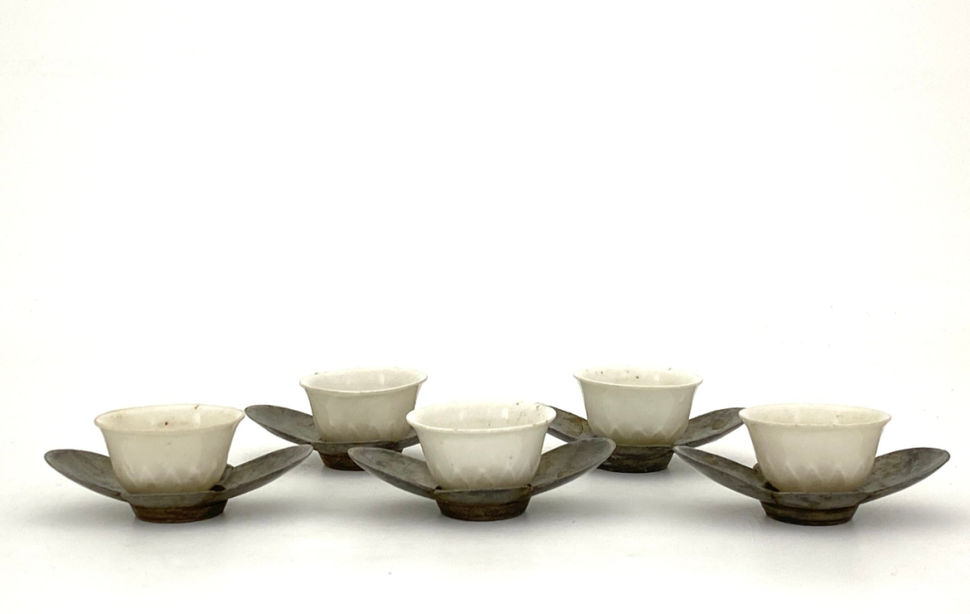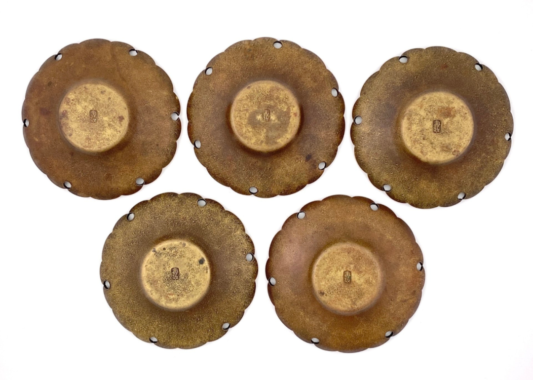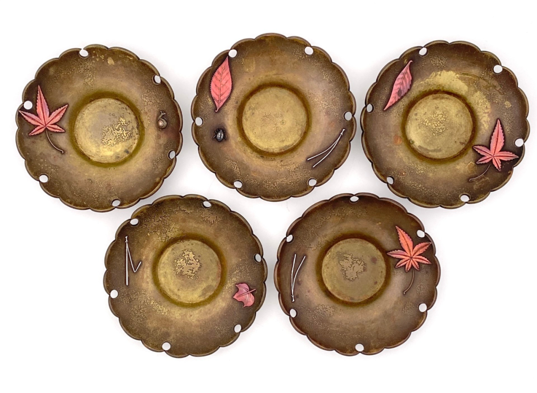 拍品估价:100,000 - 200,000 日元Lot 456 “初代内山大介”造 铜错银叶虫纹茶托 五件一组