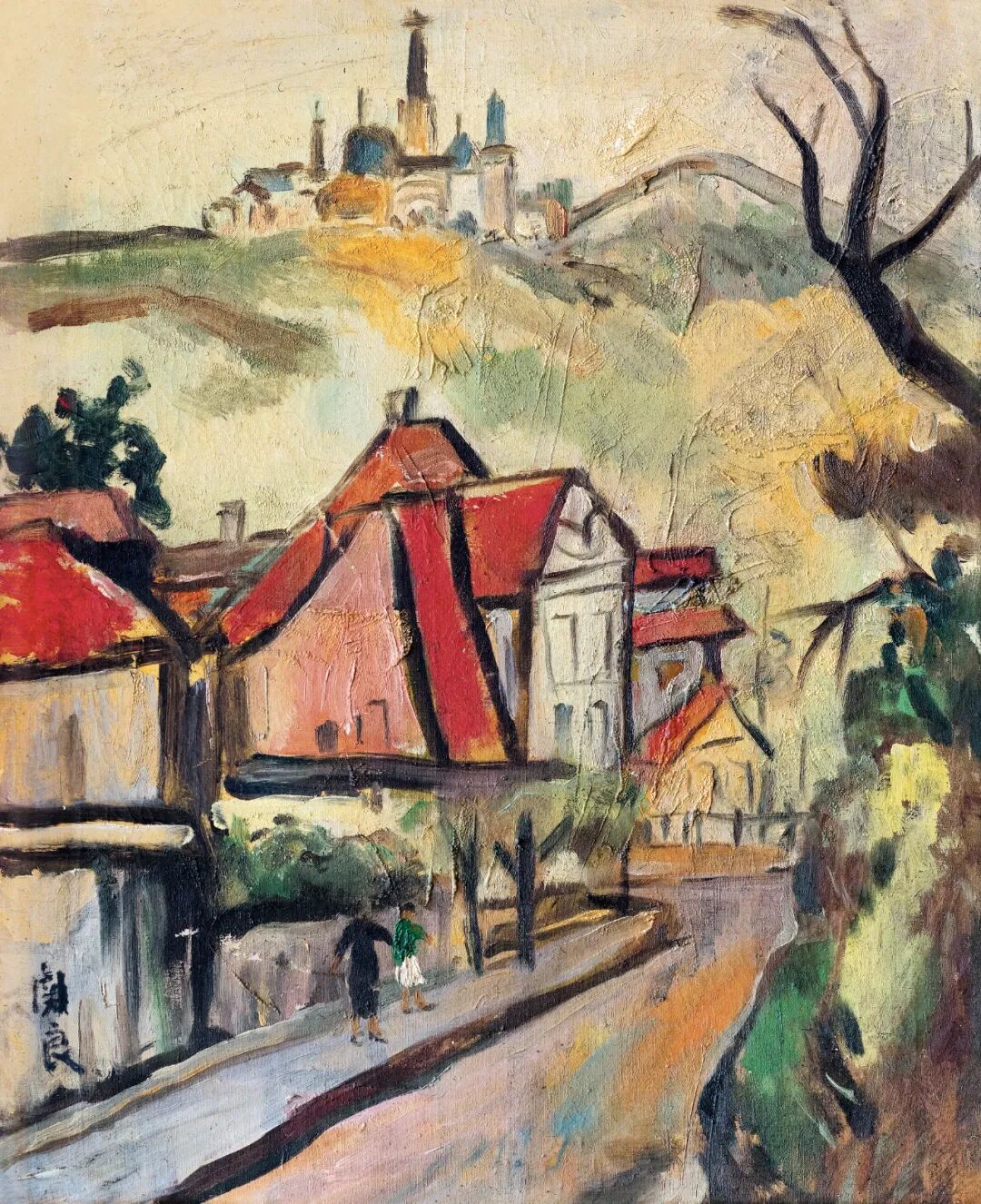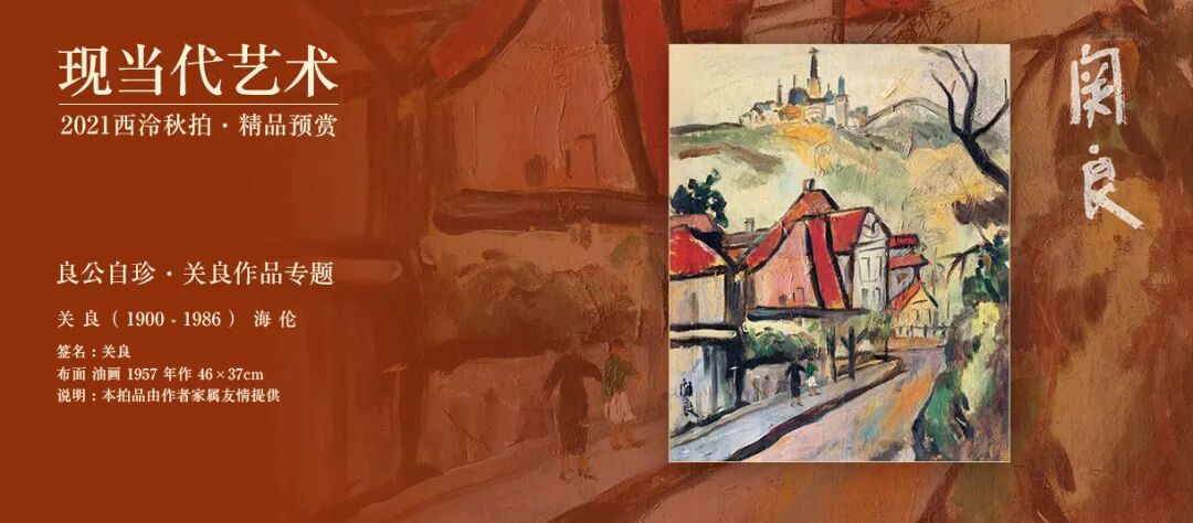 1957年,我国文化部为中德文化交流签订协定,特派李可染、关良等作为代表团成员远赴东德访问,在东柏林举办个人画展,莱比锡“伊姆茵采尔”出版公司为他出版画册。在德期间,关良深受当地充满西方风情的风景所感染,创作了一系列的德国风景作品,并始终由自家珍藏。此前“高妙传神”专题所呈现的两张油画亦为此系列的作品,首现拍场便受到了众多藏家的偏爱和竞购。之前的两幅德国系列作品都是横构图,近水远山的景色,这幅《海伦》有些不同,一条极具欧洲风情的小街巷成对角线延伸上去,围绕它所展开的近景占据了画面三分之二,虚实相生。加粗的轮廓线、丰富而和谐的色彩将近景那种生活化和画家内心的愉悦感宣泄出来,远处的教堂矗立在山间,更加凸显出画作浓郁的现代艺术气息。德国之行,对于关良的艺术人生来说,是浓墨重彩的一笔。他的艺术代中国赢得了欧洲人民的赞赏和喜爱,他也得以近距离呼吸到现代艺术的气息,畅游神往。将这种愉悦带给自己的家人,未尝不是最好的礼物。“生活有趣,艺术就有趣;生活多彩,艺术也多彩。”是关良常常挂在嘴边的一句话。《海伦》这同一景致在画家笔下多有创作,可见关良对它的偏爱和对其构图和色彩搭配的自信。而出现在2021西泠秋拍上的这张油画作品,却有它独特之处,这是当年关良最为喜爱的一幅作品,在家中悬挂多年,弥足珍贵。17岁时关良随家兄东渡日本留学,要去学他想学的“一无用处”的绘画艺术而不是当时热门的化学专业。父亲理解他,对此给予了无条件的支持。正是因为有这样的父亲,所以关良也成为了这样的父亲,而关良给予儿女最好的爱,也正是这种不干预和艺术的熏陶吧。![]()