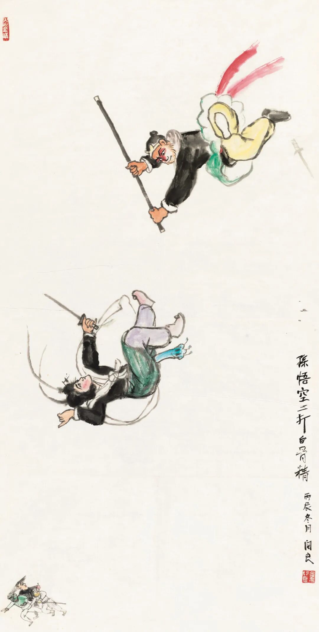 为表心中快意,良公画了不少《三打白骨精》这场戏,但眼前这幅绝对是最具艺术表现力的。竖长的构图上,孙悟空把白骨精打翻在空中,那一双雌雄双剑已经掉了一只去,可见已无还手之力,画面左下角的三个小鬼惊恐不已,夺路逃命去,但清风不会缺席,他们哪里逃得出良公的画面,又哪里逃得过历史的评判。良公曾说过:“古人画马,能忘心于马,即无见马之累,成象已俱,寓之胸中,兴来则信笔一挥,腾骧而至,尽入我缣帛中也。画戏亦然,意不在于画,则得于画也。”“所以这小小的舞台(两广会馆的戏台)不仅在我以后的艺术生涯上产生了一定的作用,而且对我的处世为人也起了潜在的影响。”