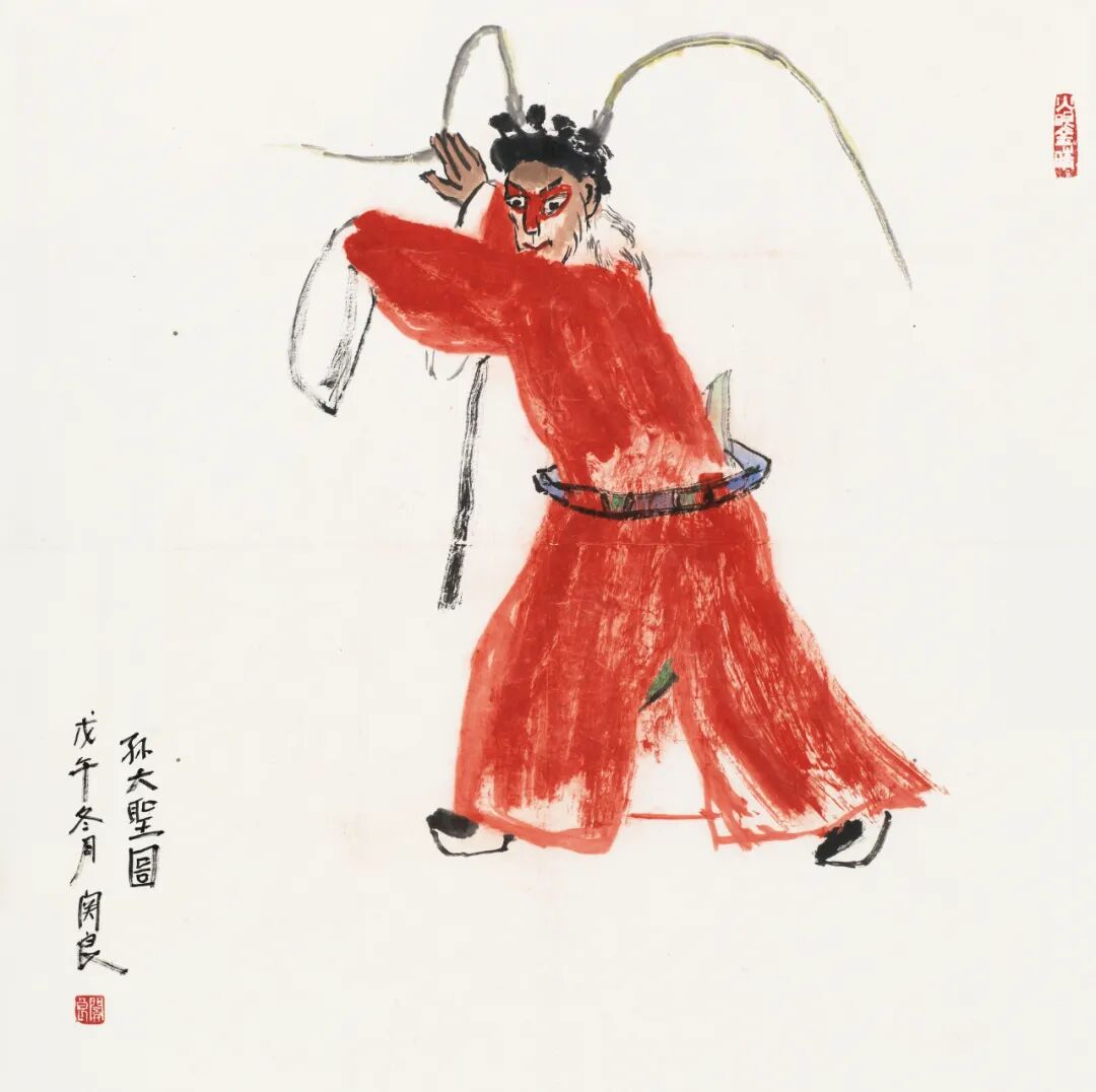 原著中相关章节对美猴王穿着的描写是:“头戴紫金冠,身穿赭红袍。”这红袍加身,虽然只是一个小小弼马温,却可视为悟空进入神仙界任职之始。这抢眼的大面积红色,彰显出画家经过十年文革,内心的欣喜和欢腾之势,象征着艺术可以重新立于中国大地之上,焕发无限生机。