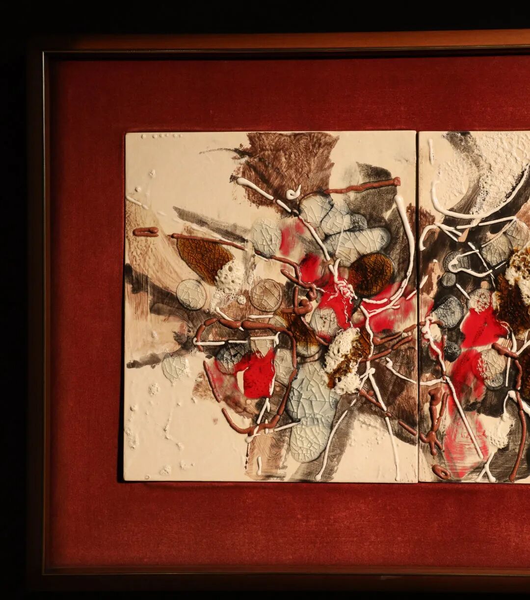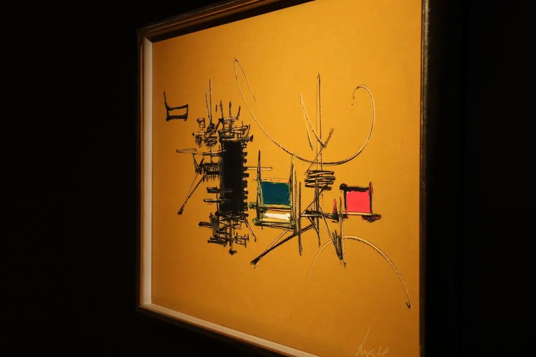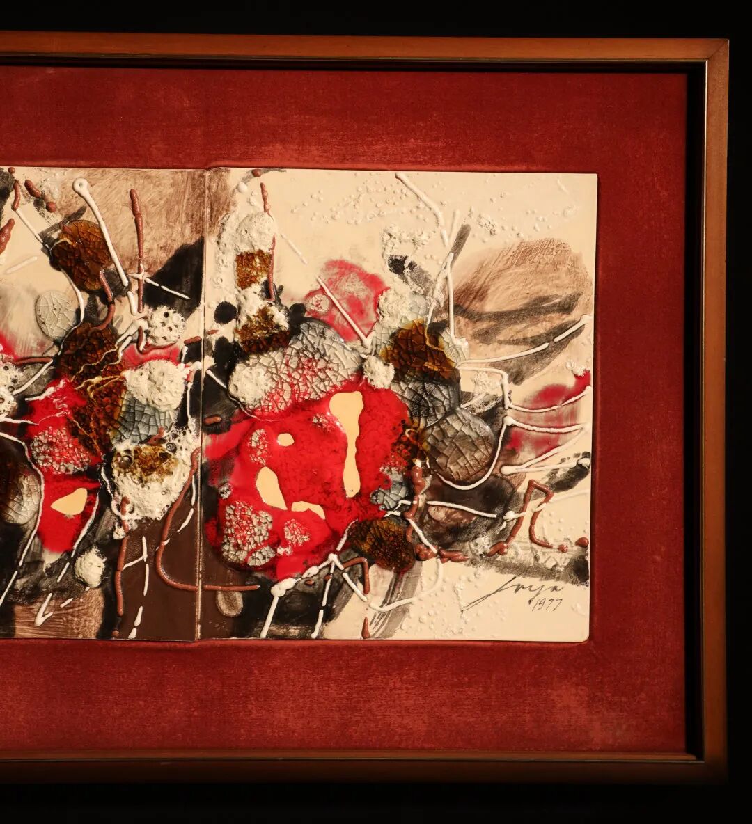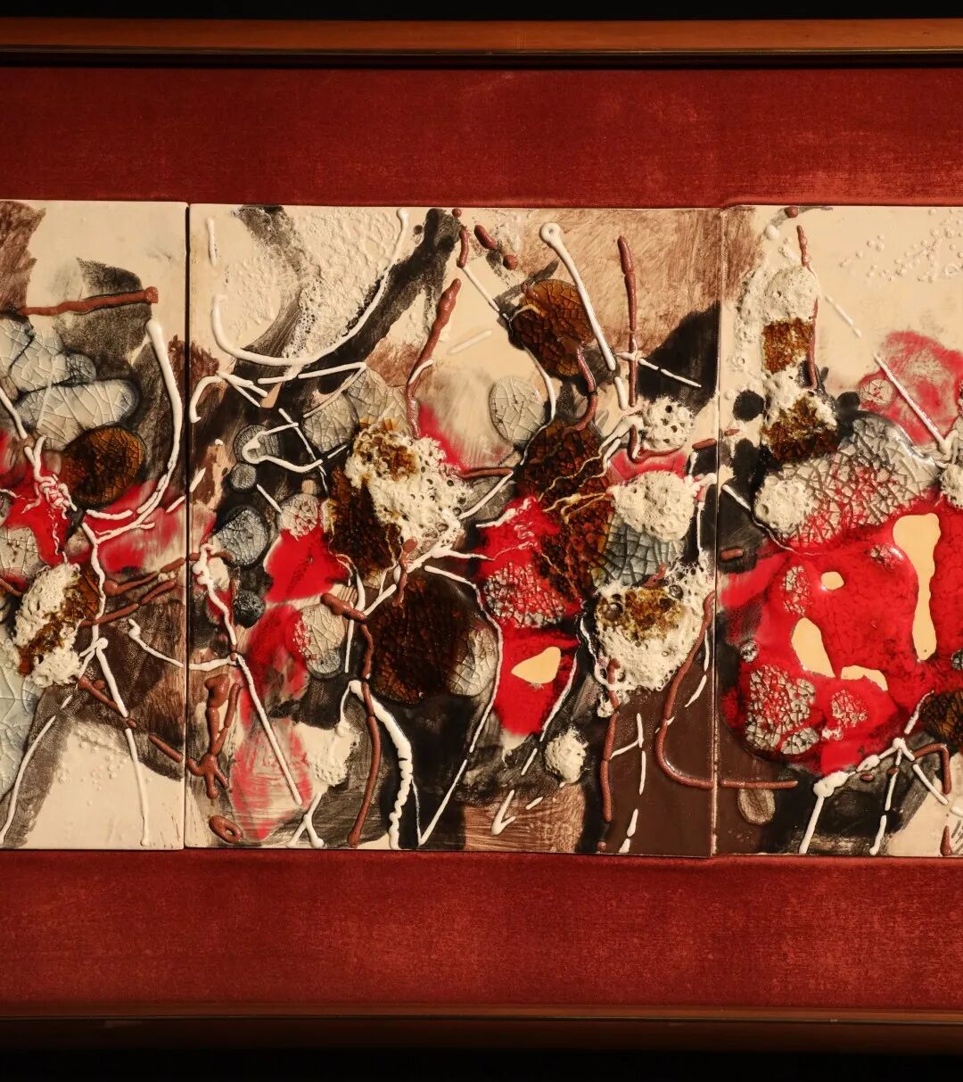 三联屏作品《无题》创作于1977年,荷西荷雅罕有地采用精致典雅的陶瓷作媒介,富有书法笔触的圆浑黑线,与奶白色的律动线条交织成生动的画面,炫目的朱红色块更为整体画面注入微妙的张力。作品展现荷雅深受美国抽象表现主义之中的「行动绘画」风潮影响,如此笔意鲜明而且富有动感的风格,盛载着荷雅在创作过程中的无限奇想,充满艺术家的个人意识投射。