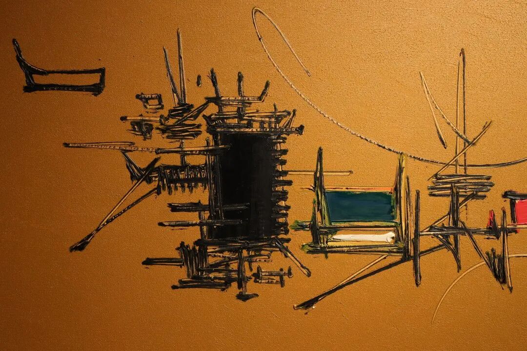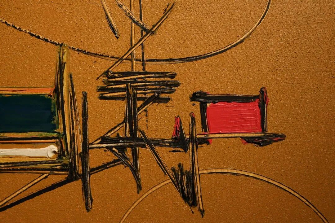 画布正中央的橙色散发着温暖的光芒,有如日落时映照在农田上的光线,与书法般的黑色笔触形成强烈的对比,令人联想起曳引机在田地里运行时的强力。艺术家在本作中运用的几何图形——饱满的绿色圆形及长方形。这些惹人注目的形状,配合周遭完美地相互融合的低调色彩,揭示了艺术家满怀深思熟虑、近乎科学化般小心精密的绘画手法。