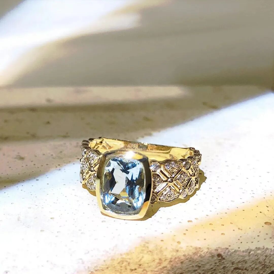 18K黄镶1.5克拉海蓝宝伴钻石戒指