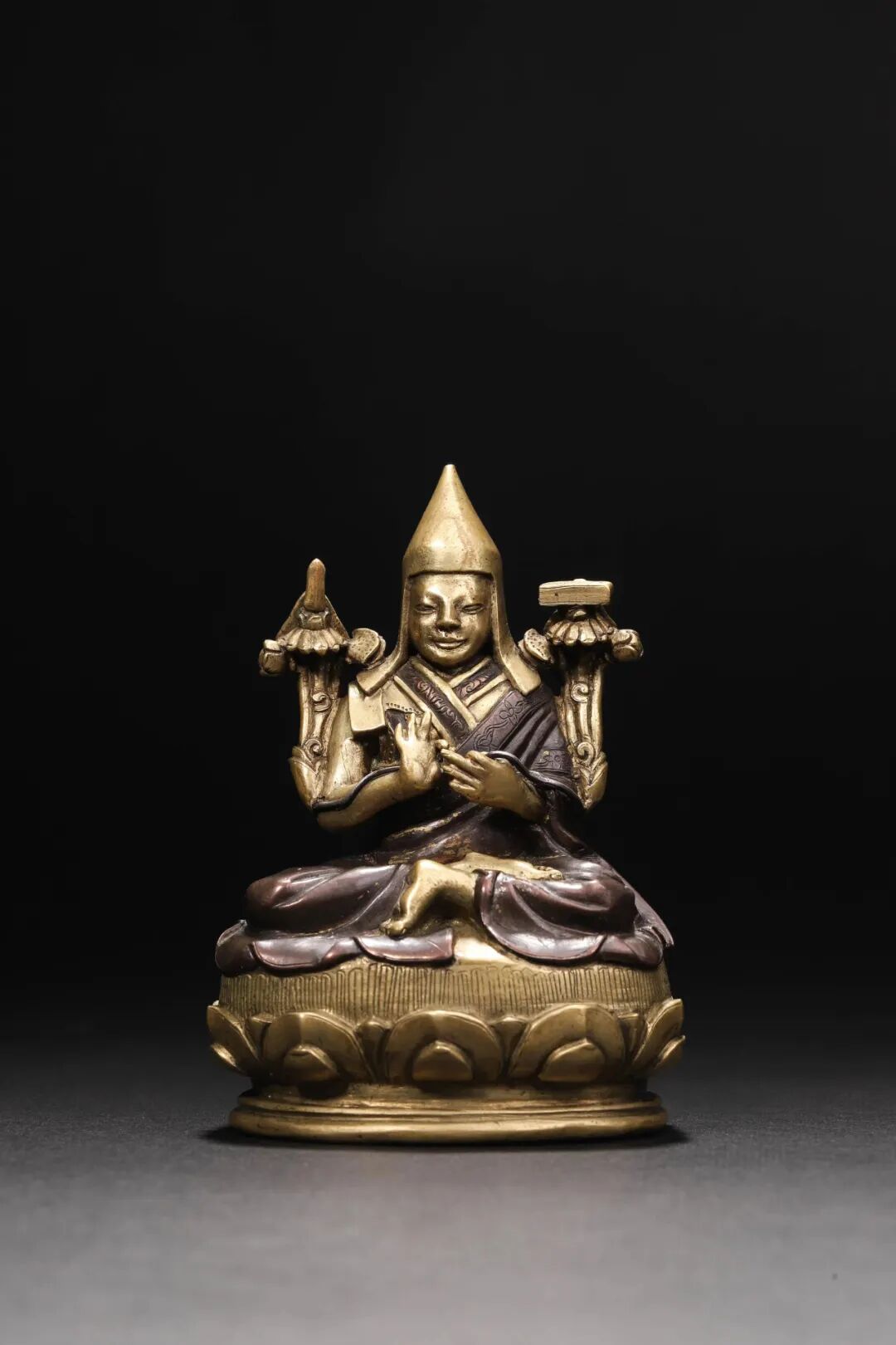 此尊上师头戴标志“通达五明”的班智达帽,面容安详沉静,双手持莲茎(银质)接转法轮印,左右肩头的莲花分别托经箧与宝剑,象征其具有无上的智慧弘扬佛法。结金刚跏趺坐于莲台之上;其身着交领式僧衣,左肩斜披袈裟,边缘自然铺在底座上沿,层层褶皱凸显出丝织物的柔软质感;衣物边缘装饰精致的花纹;莲座的样式在喀尔喀蒙古造像中常见,莲花莲瓣宽厚饱满,刻画有力,细致精美。尤其值得注意的是,该尊造像采用双色铜铸成,分别使用黄铜和紫金琍玛乾红铜,质感温润,犹如丝绸,外衣与内衣莲座区分,装饰效果极佳,工艺出色。这样的工艺复杂且精致小巧的造像,可以肯定,在铸造初便受到极大的重视,极有可能是受大寺庙委托,或由重要人士捐施的高级订制。1.7月15日中午藏友签到,领取会议流程表,安排房间住宿。精品展布展。