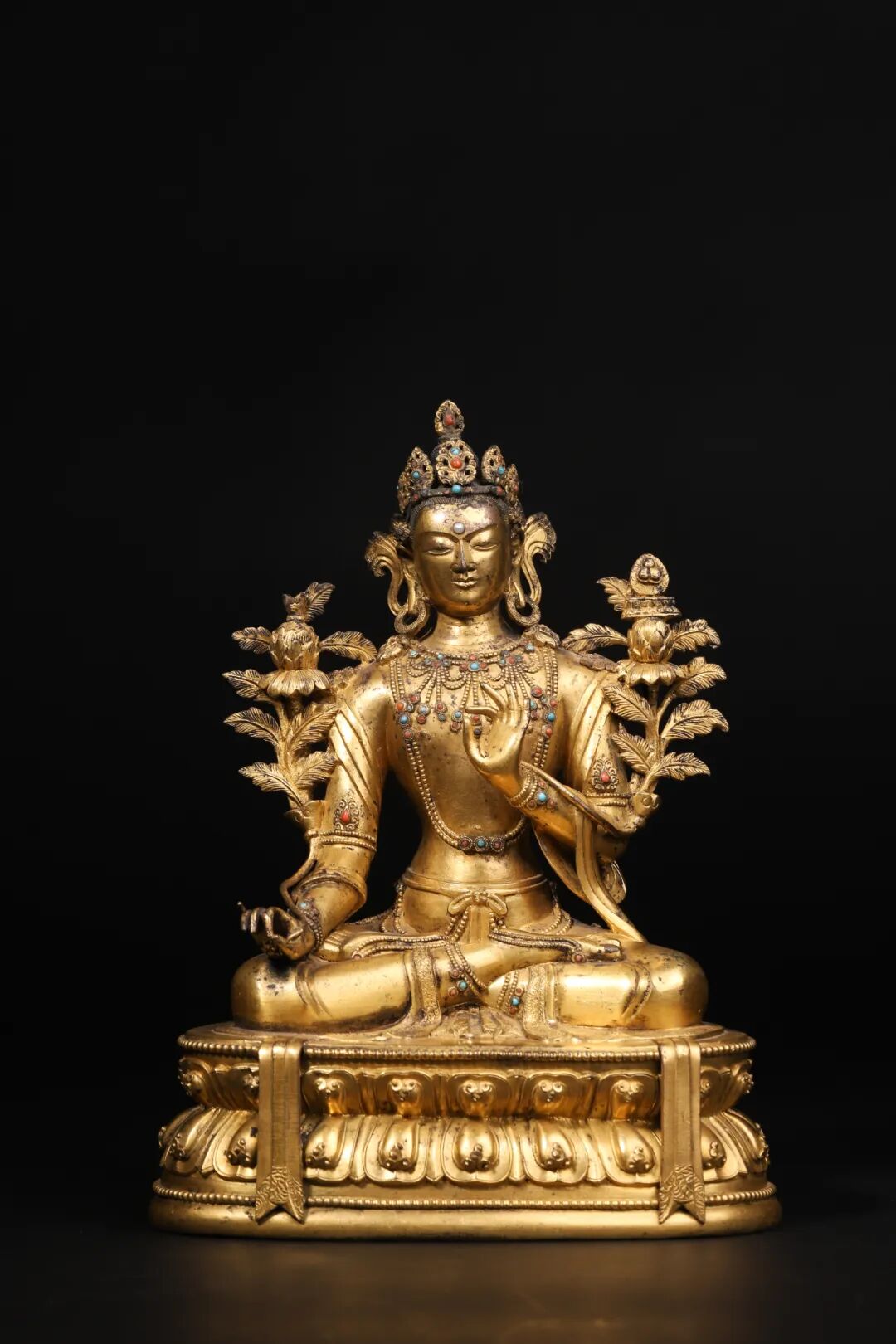 虚空藏菩萨的梵文为“Akasagarbha”,中文意译为“明星”。虚空”意为大、无尽,“藏”并不单指财富,还包括智慧、功德,所以“虚空藏”是指菩萨的智慧、功德、财富如同虚空一样广阔无垠。佛经中描述释迦牟尼佛在菩提树下开悟的刹那,抬头一望,见到天上突然有一粒星星飞过。这款星星便是虚空藏菩萨,代表开悟释迦牟尼佛的宇宙智慧。所以整个宇宙的日月星晨、风雨雷电等事物的管辖,归於虚空藏菩萨。虚空藏菩萨更被誉为三世诸佛“第一辅臣”,功德浩荡遍满虚空,智慧无边恒沙难喻,忍辱心如金刚,精进猛如疾风,具足一切三昧。虚空藏菩萨系密教胎藏界曼荼罗虚空藏院之主尊、现图胎藏曼荼罗释迦院之释迦右方胁侍、金刚界曼荼罗贤劫十六尊之一。根据《观虚空藏菩萨》中的描述:菩萨头上戴着五智宝冠,宝冠内有高髻,称为宝髻,这宝髻等於整个宇宙的中心,代表须弥山。虚空藏菩萨身上的配饰繁多,额间白毫嵌宝珠,另有耳环、项饰、胸饰、手镯、脚钏等珠宝,身披天衣,雍容华丽。右手持莲花,莲花中有带焰宝剑。尊上所拿的宝慧剑和宝珠,被众生认为的表示智和福,左手拇指与食指想捻,说法传道,护持众生,结全跏趺坐于双层仰覆莲瓣之上,端庄大气。康熙时期宫廷造像数量不多,但铜质厚重,加工精良,素为藏家所重。这一时期宫廷造像内容单一,以无量寿佛为主,此尊虚空藏菩萨题材罕见,面相慈悲,戴枝叶繁密的宝冠,缀圆形花瓣状精致宝冠,束发缯带在耳后飘起,托珠为饰,胸前饰璎珞项链,珠粒精圆匀称,手镯、臂钏、脚镯均精工细作,堪称完美。所有的花饰部分均嵌各色珠石,衣缘裙边均有细密刻花装饰,更彰显其华丽。无论是面容还是肌肤都透露出年青的气息,胸部肌肉丰满圆润,但匀称有力,腹肌饱满,腰肢柔和,鎏金肥厚,富丽堂皇,令人感受到工匠处理铜鎏金的高超技术同时,仿佛能触摸到年轻的质感和温度,这不仅仅是风格所致,更是一个时代的风貌,堪堪宫廷重器,皇家法度。
