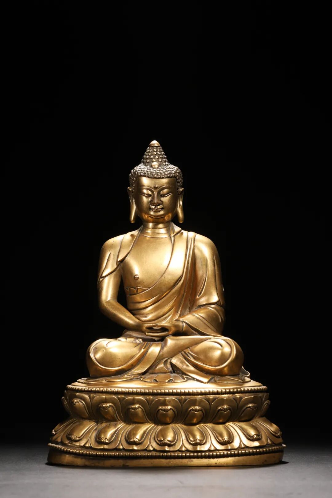 此尊造像为明代阿弥陀佛,身躯饱满结实,线条简洁流畅,丰腴而不虚,近人而不俗。头饰螺髮,高顶肉髻。额头宽平,面相丰润,细眉长目,高鼻薄唇,大耳下垂,表情庄重而不失柔美。身著通肩袒右式衲衣,内著僧祇支,衣著轻薄贴身,线条流动柔和,衣褶转折自若。佛陀双手结禅定印。下承束腰仰覆式莲花座,莲瓣挺拔饱满,前端有云头纹,上下缘皆饰细密的连珠。整像造型沉稳,端庄肃穆,鎏金璨璨,具有元末明初汉藏风格佛造像的鲜明特征。