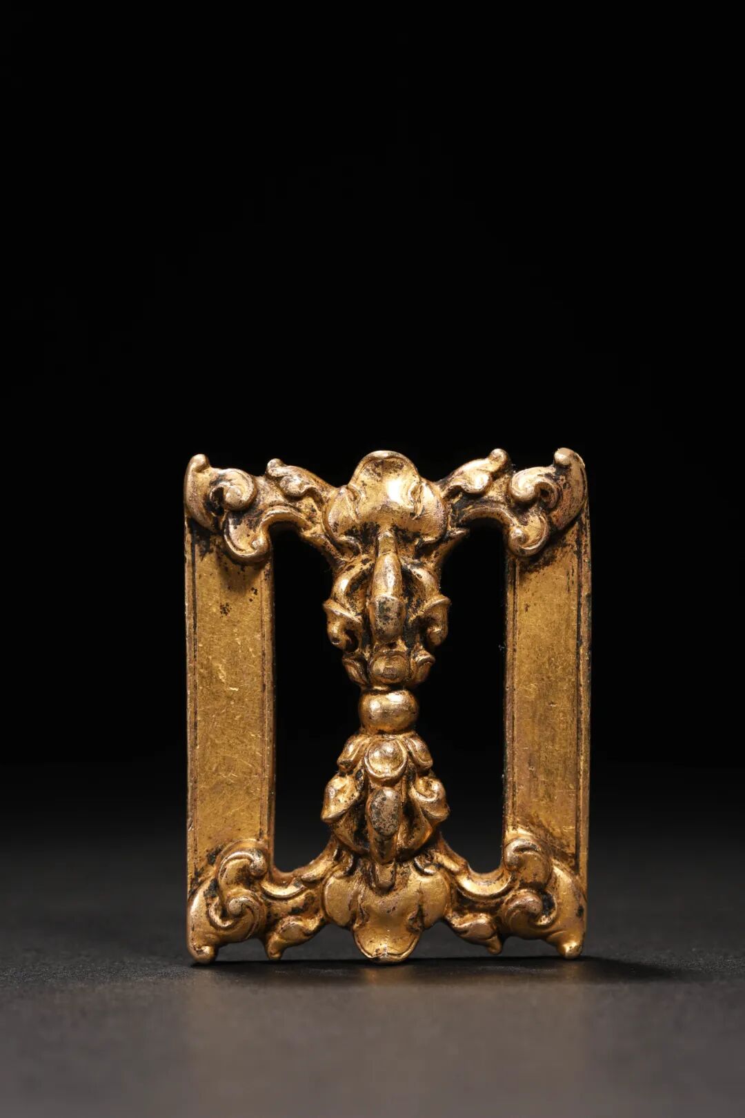 此枚经书扣简约大气,规整的几何边框上,中间仅见一枚横置的金刚杵,壮硕有力,左右两侧点缀着变体的卷草枝叶,煌煌大气,立体感极强,具有极高的艺术性,且经书扣保存完好,中间的金刚杵亦十分饱满,各股都精雕细琢,杵体虽无过多的装饰,但金黄的铜质表面包浆纯熟,更添韵味十足。