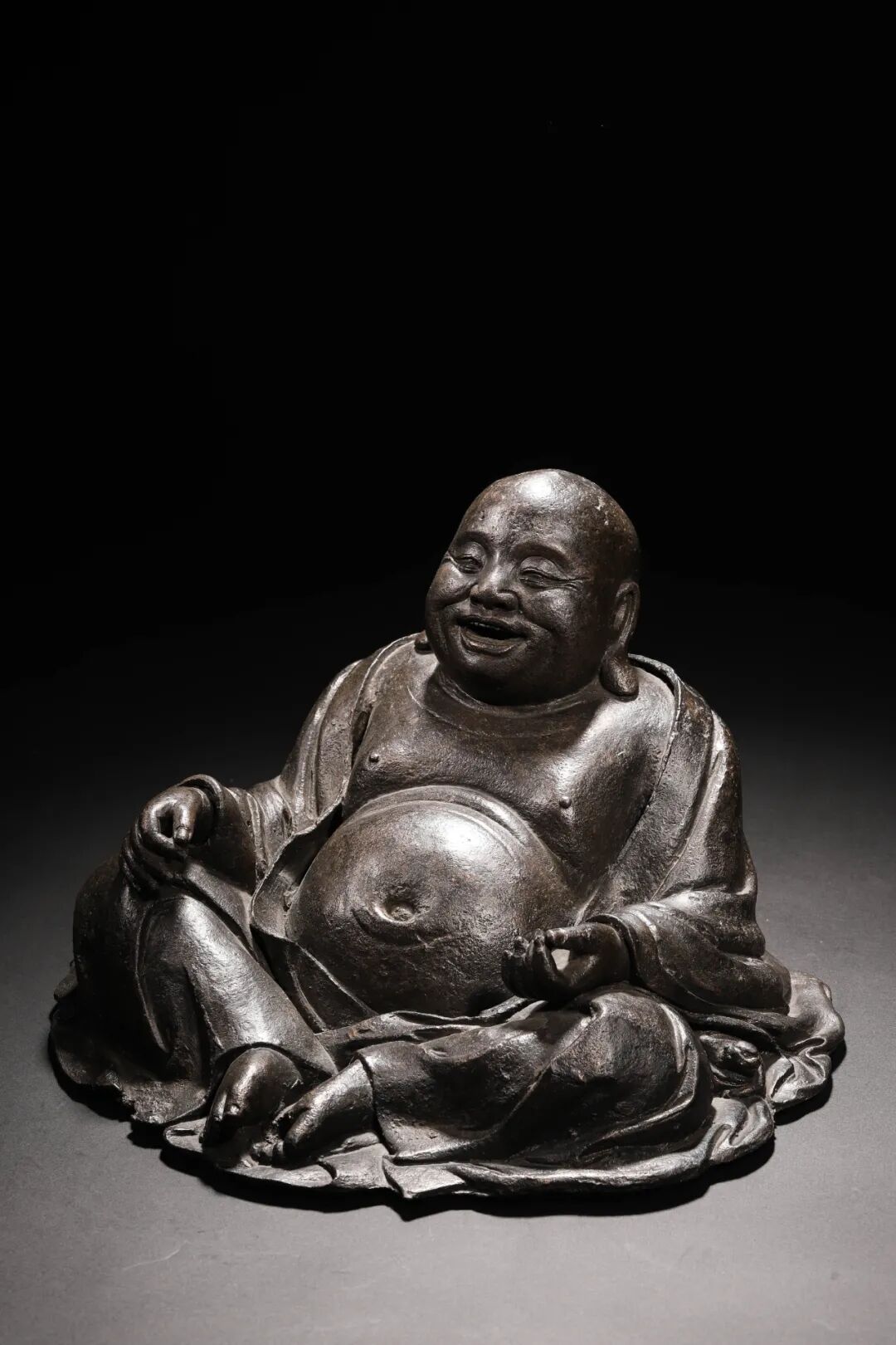 此尊大肚罗汉像青铜所铸,造型饱满深峻,面丰耳阔,硕腹巨颡,福态寿姿,眉目莞尔,瞳如杏仁,精光内蕴,蒜头鼻,鼻翼丰满,写实感极强。罗汉身着袈裟,宽袍广袖,衣纹流畅婉转。右手置于膝前,左手拇指食指相拈,神机妙算,衣袖中袒露出一小兽,题材罕见,区别于后世布袋和尚造型,此谜团种种待有缘人参悟。整像通体包浆古雅醇厚,尽显悠悠岁月之痕,天地苍穹之息,人间烟火之气。
