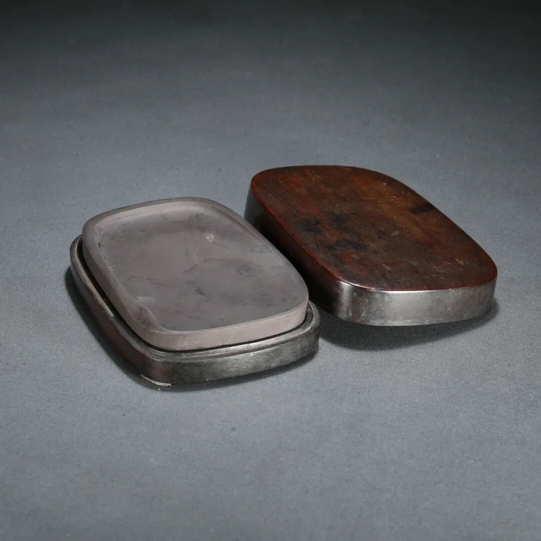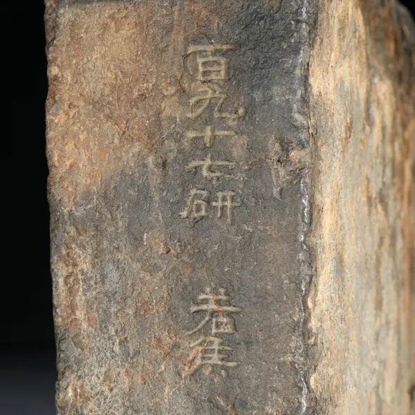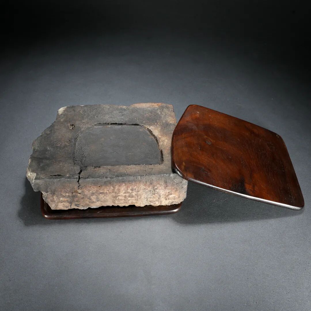藏者简介:陆增祥 (1816~1882),字魁仲,号星农、莘农,江苏太仓人。道光三十年(1850)一甲一名进士,官翰林院修撰,历官湖南辰永沅靖道,有政声,以疾告归。少通六书,好学博览,精金石学《八琼室磗砚录》、《八琼室皕磗砚录》。说明:以古砖制砚古已有之,至清代金石学兴起而滥觞。制作者大多选汉、晋之砖,因其多有图案文字,高古淳朴,极具赏玩价值。此砚以古残砖改制,开拱形池。一侧有“百九十七砚”隶书铭文。此砚包浆醇厚,气息高古,置之案头,雅意弥漫。配楠木天盖。