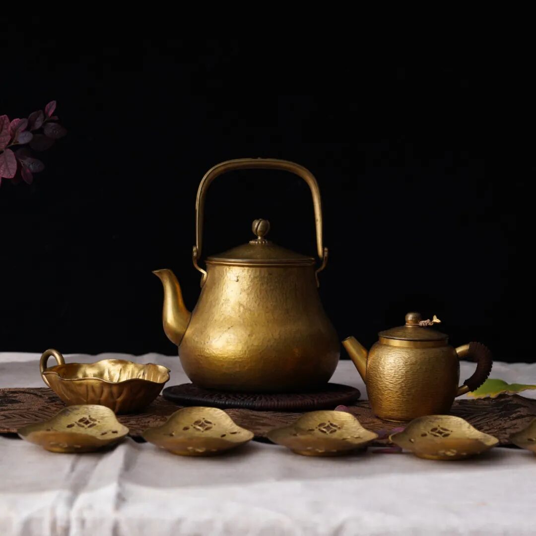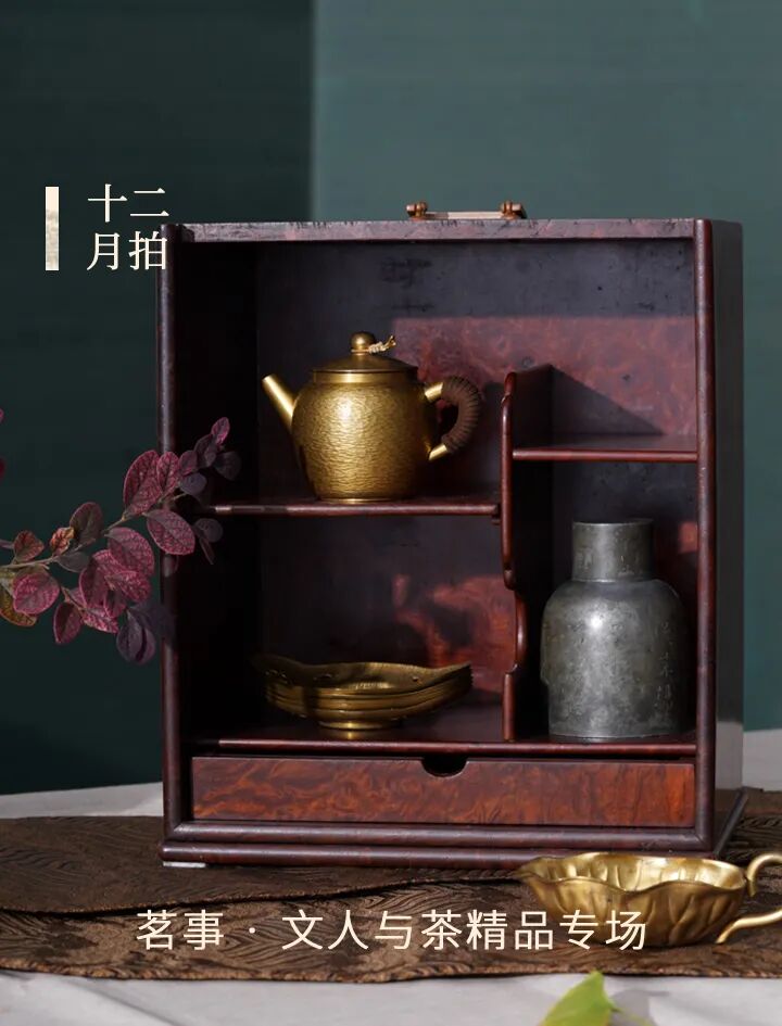 明治(1868-1912)·中村铭铜鎏金茶具一组八件汤沸高:17cm 长:14cm 直径:12.5cm壶高:7.5cm 长:10.5cm 直径:6.8cm说明:此组拍品由汤沸、小急须、汤冷及茶托等九件茶道具组成,铜制,通体鎏金,是为茶室空间陈设实用之雅器。说明:附作者证书及其子鉴定合照。此壶造型简约,身若井栏,风格高洁古雅,壶体扁圆,圆腹上收下敛,圆折肩,环形耳把,短流微曲,出水甚好。整体造型,粗细对比,曲直相间,圆润中透出古朴韵味,造型洗练却无以增减。器身镌刻诗句:“汲井匪深,挈瓶匪小,式饮庶几,永以为好”,茗茶之韵尤显,文人气息浓厚。![]()