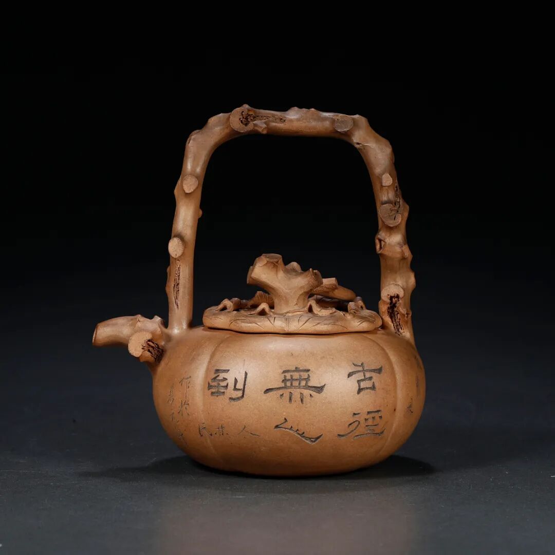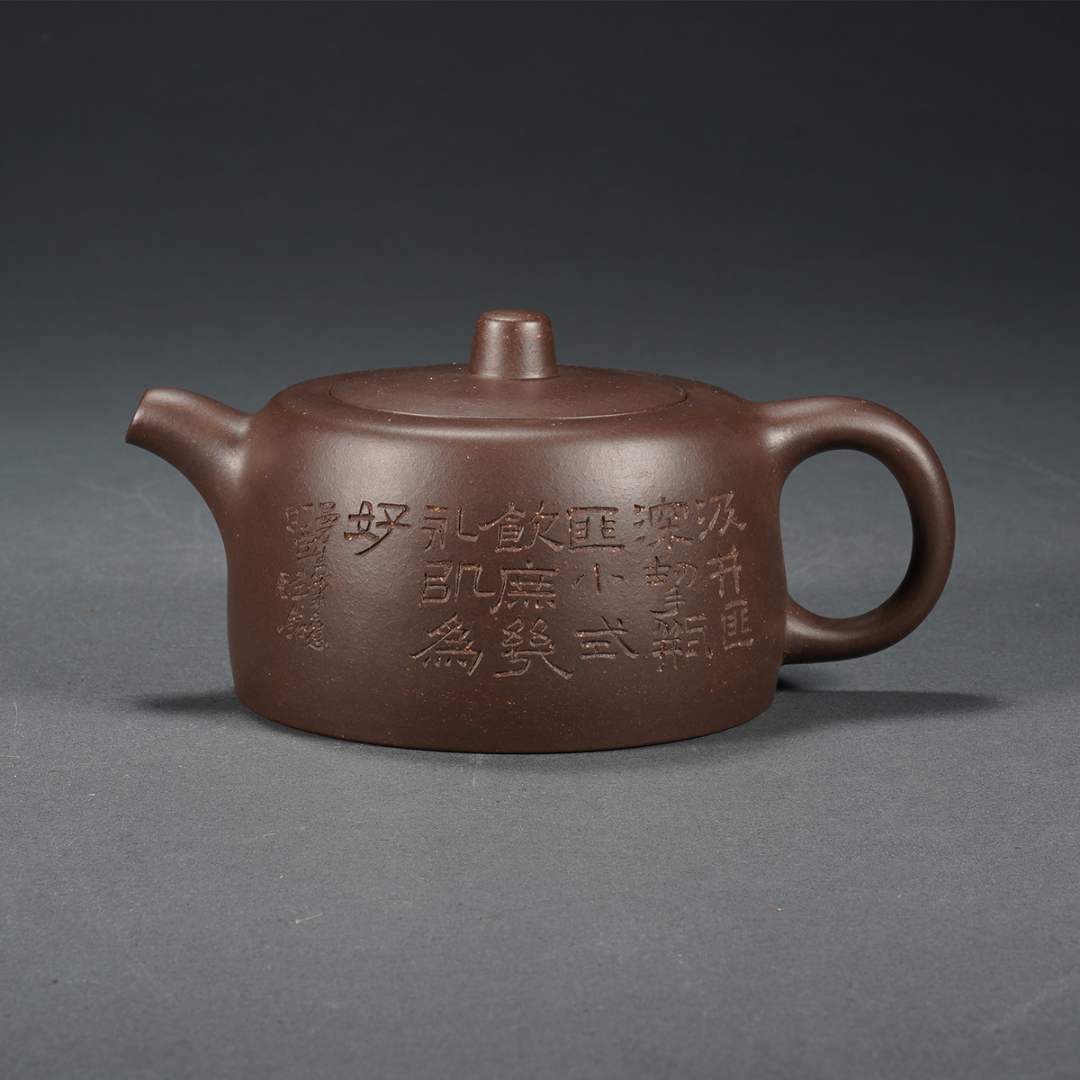 说明:此件段泥提梁壶壶身捺底,壶流作枝干状,拟态生动,做工精湛,在沉静肃穆中蕴藏着勃勃生机。壶盖内钤“星甫”,壶上所刻为:“古径无人到。人林氏作于鼎元轩。庚申夏”,可知此壶作于1920年夏。镌刻画面丰富传神,书法古意盎然,极富金石韵味,且壶保存完好,包浆淳朴,全器形态自然亲和,颇有风韵。
