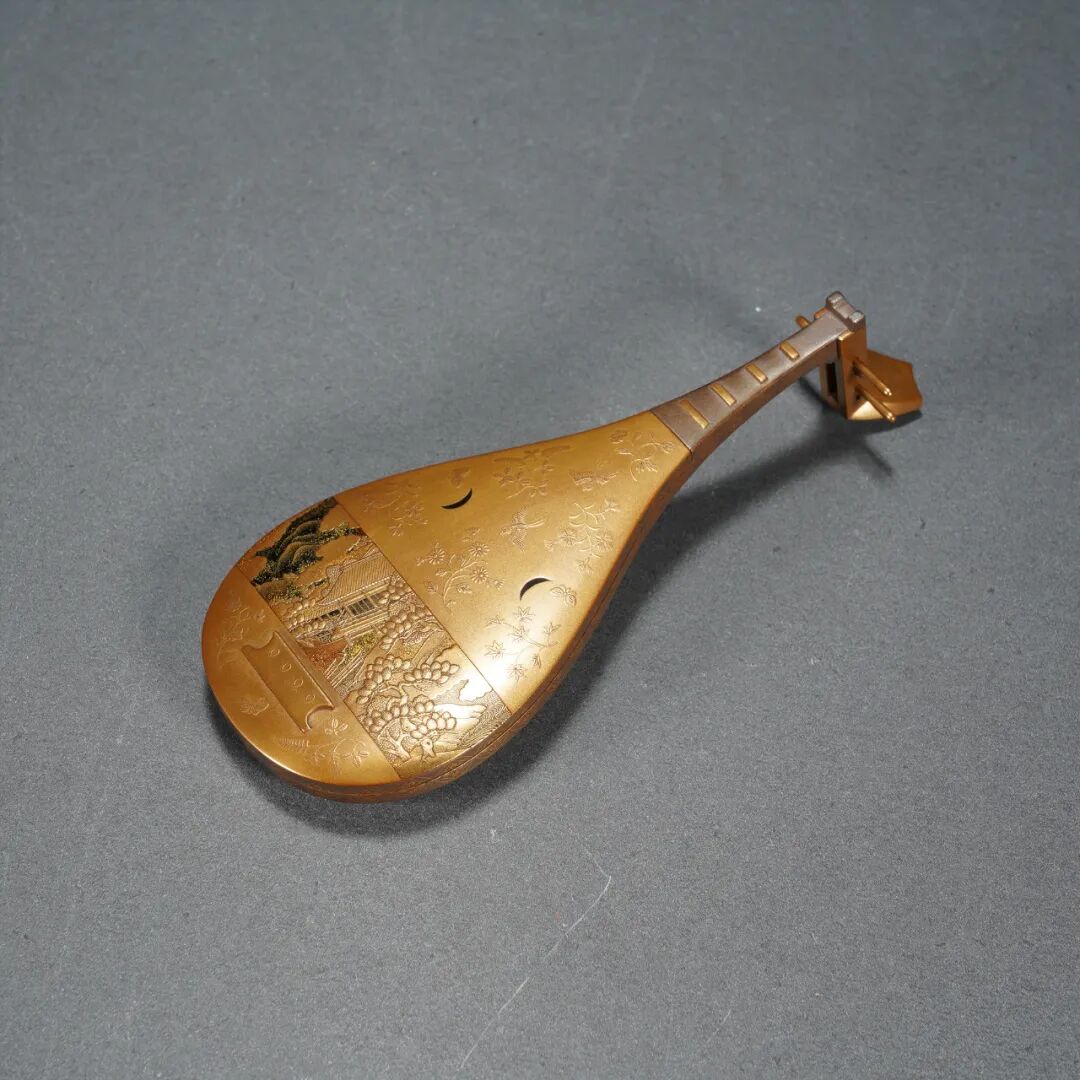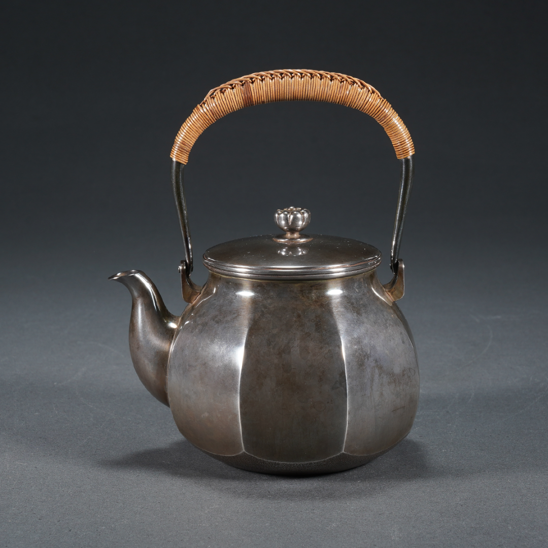 高:16.5cm 长:12.5cm 直径:10cm说明:提手可拆卸。此件汤沸为纯银制,器型周正,八面取,器身光素,嵌入式盖上缀花摘,具有点睛之妙;鸽子形流,出水一气呵成, 藤把隔热,整体简洁明快,自然大方。提手可拆卸。此件汤沸为纯银制,器型周正,八面取,器身光素,嵌入式盖上缀花摘,具有点睛之妙;鸽子形流,出水一气呵成, 藤把隔热,整体简洁明快,自然大方。说明:附共箱。此件拍品造型作琵琶型,外饰高肉金莳绘花鸟风景图,内髹金梨地,满饰金光,形制极高。