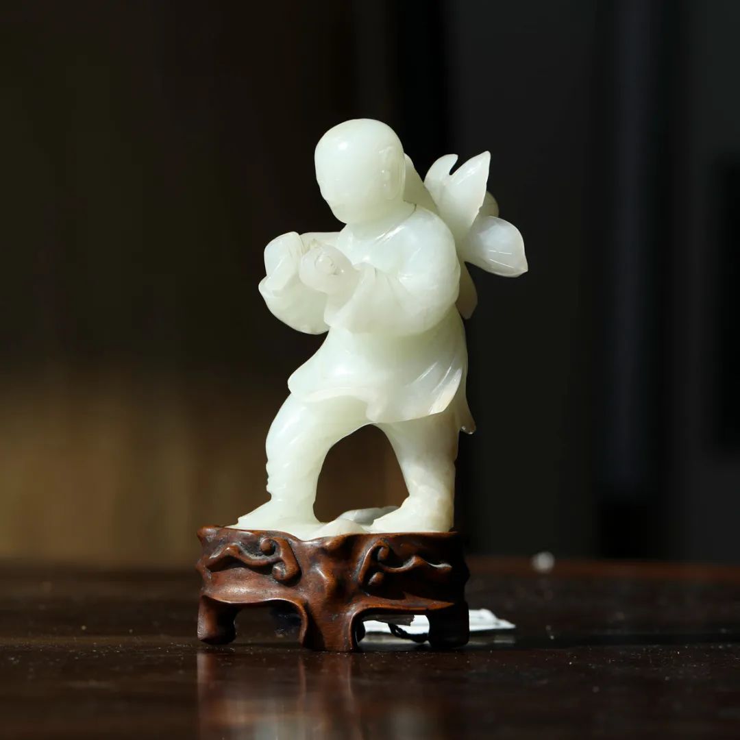 出版:“LADY LOUIS life of the Countess Mountbatten of Burma”,英国伦敦奥德姆出版社 (ODHAMS PRESS LTD,LONG ACRE, LONDON),1952年。来源:伦敦苏富比,2021年3月24日,Lot65 缅甸蒙巴顿伯爵夫人的家庭收藏。说明:本品取精良白玉而琢,玉质致密温润。作品整体以圆雕为主,圆雕一踩荷执莲的童子形象,童子呈跨步行走状,笑容可掬,手执荷花茎叶,贴于身后,一副天真烂漫之态。整器以阴线刻出大部分纹饰,工艺简约而不简单,直线、弧线运用较多,雕工精湛。童子面部神态刻画尤为成功,表现出天真无邪的童真童趣。整器雕刻手法写实细腻,人物造型比例匀称,是一件具有独特审美情趣的持莲童子作品。持莲童子是古代玉雕常见的题材之一,公私收藏亦多见,但这件玉童子的特别之处在于造型十分少见,童子双脚开叉站立,这种顶天立地的姿态显然是成功捕捉了童子欢喜雀跃时的灵活瞬间,由此可见匠师之巧思,为不可多得之玉雕珍品。原配黄花梨底座。