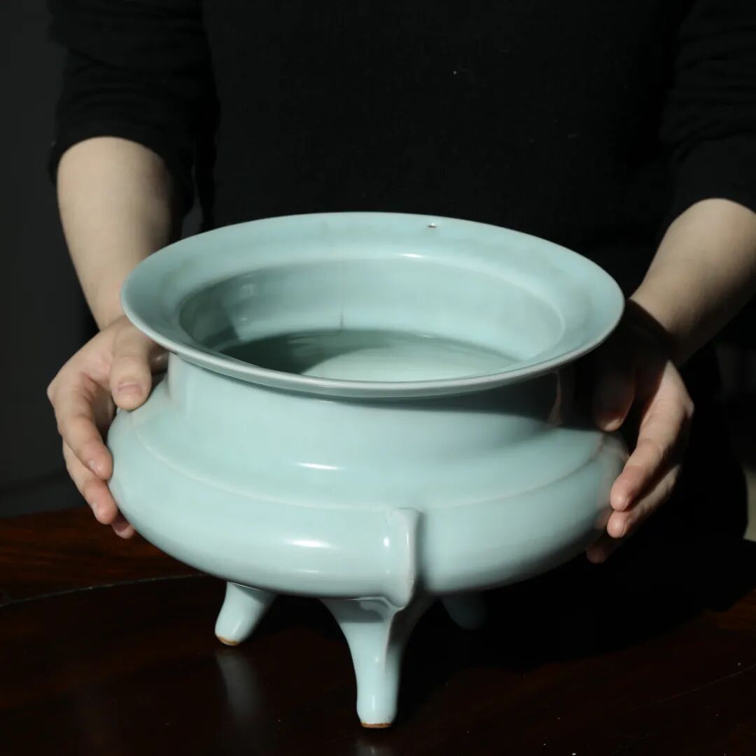 说明:本品器型为仿商周青铜鬲样式而来,故名鬲式炉,是龙泉青瓷中的典型器。相比较一般的龙泉窑鬲式炉,此炉的特殊之处在于尺寸颇大,为当前市场上龙泉窑鬲式炉中最大者。造型经典,宽折沿,沿面稍内倾,束颈,扁弧腹,下承三外撇式柱足,足底平。肩部及腹部对应三足出筋明显,向下延伸至腿足,挺立精神。直线、曲线过渡自然,变换自如,造就完美器形。足端露胎处可见胎体灰白,并泛火石红色。通体施粉青色釉,釉色粉青酥润,沉穆内敛,青碧如玉。古人仿三代鼎式器物大概有四种造型,分别为四足方炉、三足鼎炉、鼎形出香和鬲式炉,而后两者又被广泛使用于日常的香事场合。尤其是鬲式炉,颇受到宫廷及文人士大夫的喜爱,成为古人“四般闲事”中不可或缺的香具。![]()
