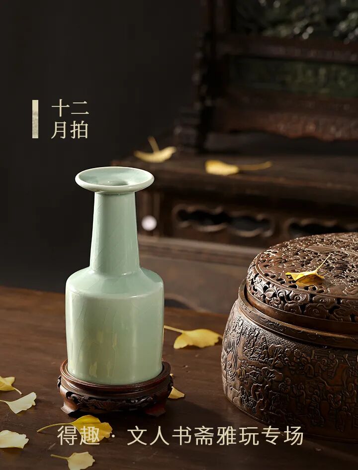 说明 本品以其外观“凤尾足长而丰,底处益散开,略同凤尾”而得名“凤尾尊”。器形挺拔,胎体厚重,通体施粉青釉,釉质肥厚,莹润素雅。整器纹饰繁复,外口沿下凸弦纹装饰,其下刻划蕉叶纹,腹部刻划缠枝花卉,纹饰刻划流畅,布局饱满。明末高濂撰《遵生八笺》之“论诸品窑器”条有龙泉窑“立地插梅大瓶,诸窑所无”及“瓶花之宜”条中“冬时插梅必须龙泉大瓶……高三四尺以上,投以硫磺五六钱,砍大枝梅花插供,方快人意”的记载,所述即此类瓶器。 美国纽约大都会艺术博物馆及底特律美术馆分别藏有一件与本品类似的凤尾尊,可资比较。