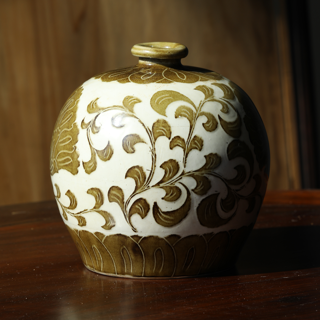 说明:嘟噜瓶流行于宋元时期北方地区,其主要功能是为了贮酒或水,因倒酒或水时会发出嘟噜嘟噜的声响而得名。通体施黄褐釉,于釉上刻划缠枝花卉,露出白色胎地,形成别具一格的艺术视觉效果。花纹刻划流畅,枝叶缠绕有致,脉络清晰,显示出高超的艺术水准。整体艺术风格敦实端庄、古朴豪放,置于雅室,更添一份爽朗大气。