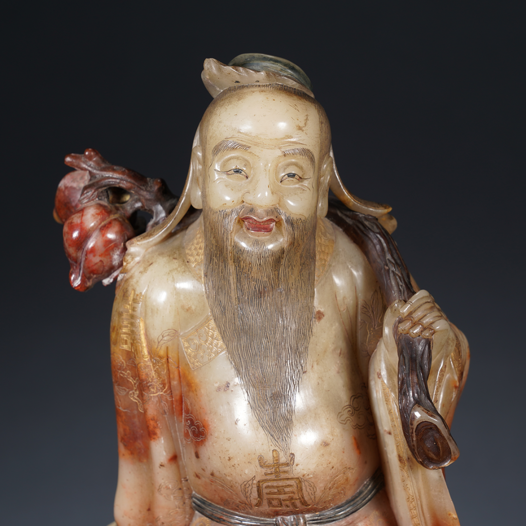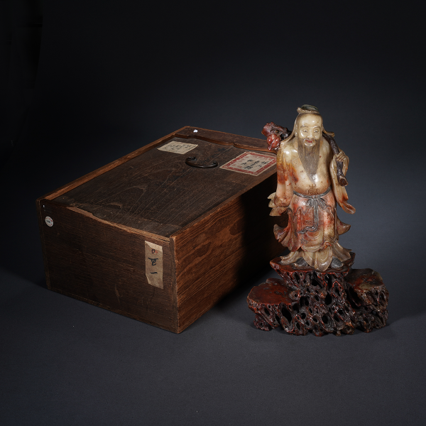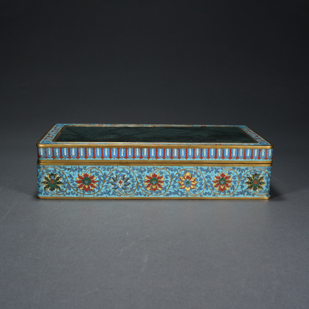 说明:寿山石材圆雕制成,东方朔神情喜悦,步步生风,手持桃枝负于身后,立于灵石之上。双目微闭,嘴角窃喜状,神情悠然颇为传神。刻工极为精细,须发丝丝分明,衣折动感飘逸,袍衫滚边皆刻花填金。石质润糯似脂,自然色别赤朱亮艳,为寿山石圆雕件之精作。 此件寿山东方朔雕像由日本南纪德川家收藏。公元1619年德川家康为巩固自己的政治势力封第十个儿子德川赖宣为纪州藩主,从此开创纪州德川家辉煌历史,至二战时期纪州德川家一直为日本华族侯爵。此件珍品后由德川家赐于正田家。正田为明仁天皇皇后美智子的祖宗。此次珍品回流故国实为可珍。来源:1.日本纪州德川家族旧藏 2.日本美智子皇后家族正田家旧藏说明:此件玛瑙水盂,取材整块大料玛瑙雕刻而成,采用浮雕技法,巧妙借助材质自身的天然颜色,雕琢青黄相间的景象。整块玛瑙质地温润,色泽纯正,色泽分明,掏膛匀净。取卷莲之天然形态入饰,青色部分凿成水盂主体,石皮黄色部分巧雕成童子、蝙蝠、双鱼等依附左右。工艺细腻精湛,运用各色间的过渡,施刀设势,将雕工之妙与玛瑙之美结合的淋漓尽致,可谓巧夺天工,承置于书房案几,意境恬然,甚为精彩。说明:整器为长方形制,边棱以镀金工艺勾框为饰,盖中嵌碧玉大料,器间各面则均以天蓝色釉为地施染珐琅彩绘装饰纹样。盒底描金变形勾云纹为底张,中央绘四如意云纹组成的开光,作对称牡丹缠枝花卉图案装饰,花朵交错分层施染描绘,齐整雅观,简约大气。此盒造型雅致,体型硕大,铜质细腻,可珍可赏。