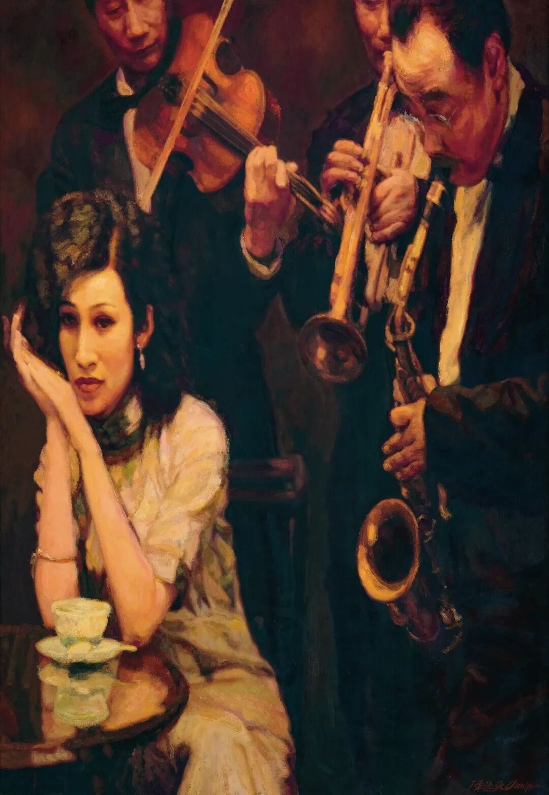 从构图上看,全幅的构图进行了精心的编排与设计。时尚与怀旧、传统与现代的张力之下,女性之美和音乐之美己经萦绕整个空间,整体人物关系层次分明,对比强烈,从而生成强烈的韵律感。