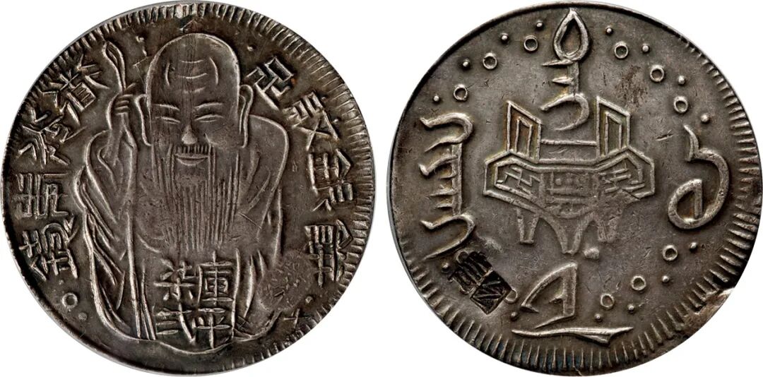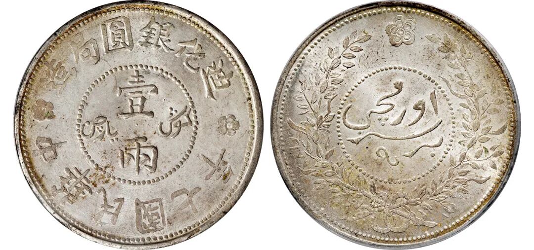 1907年新疆饷银斜回文单蝙蝠版五钱银币/PCGS VF30