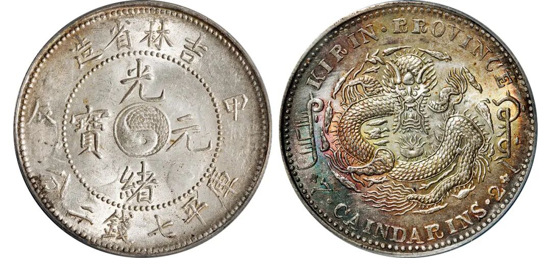 1901年辛丑吉林省造光绪元宝满文中心点圆珠鳞太极版库平七钱二分银币/PCGS MS62