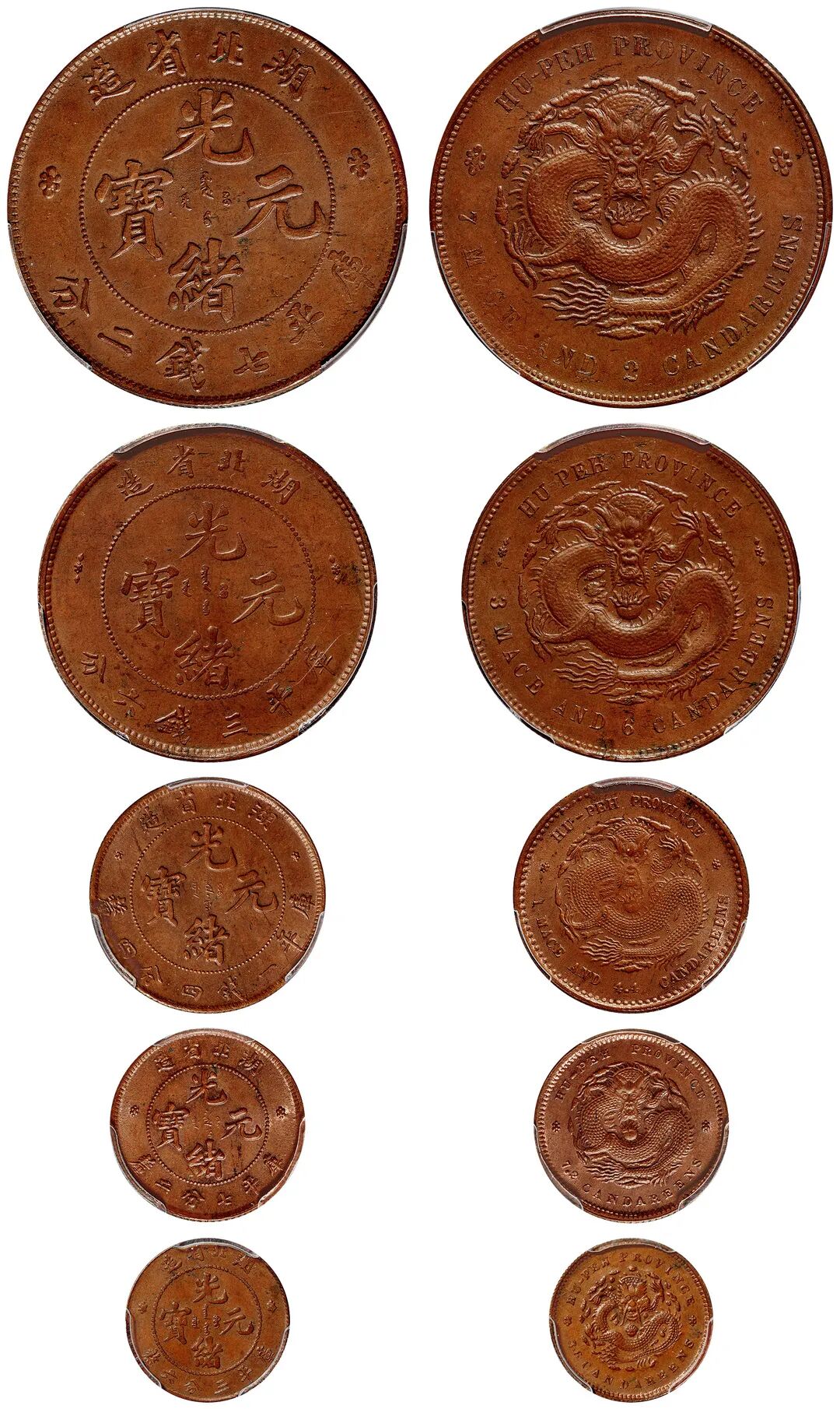 1899年湖北省造光绪元宝库平七钱二分、三钱六分、一钱四分四厘、七分二厘、三分六厘银币铜质样币五枚全套/PCGS SP63+BN-SP64+BN