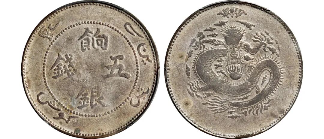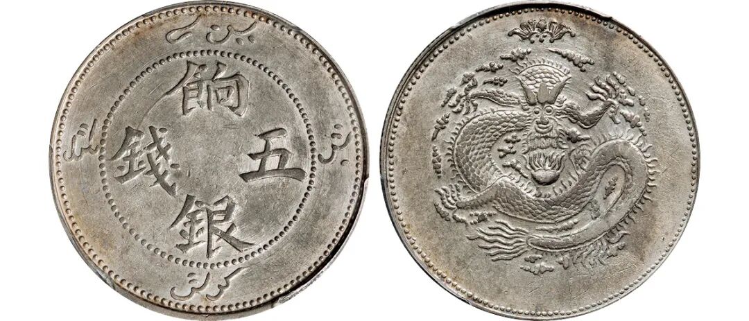 1907年新疆饷银正回文单蝙蝠版五钱银币/PCGS AU53