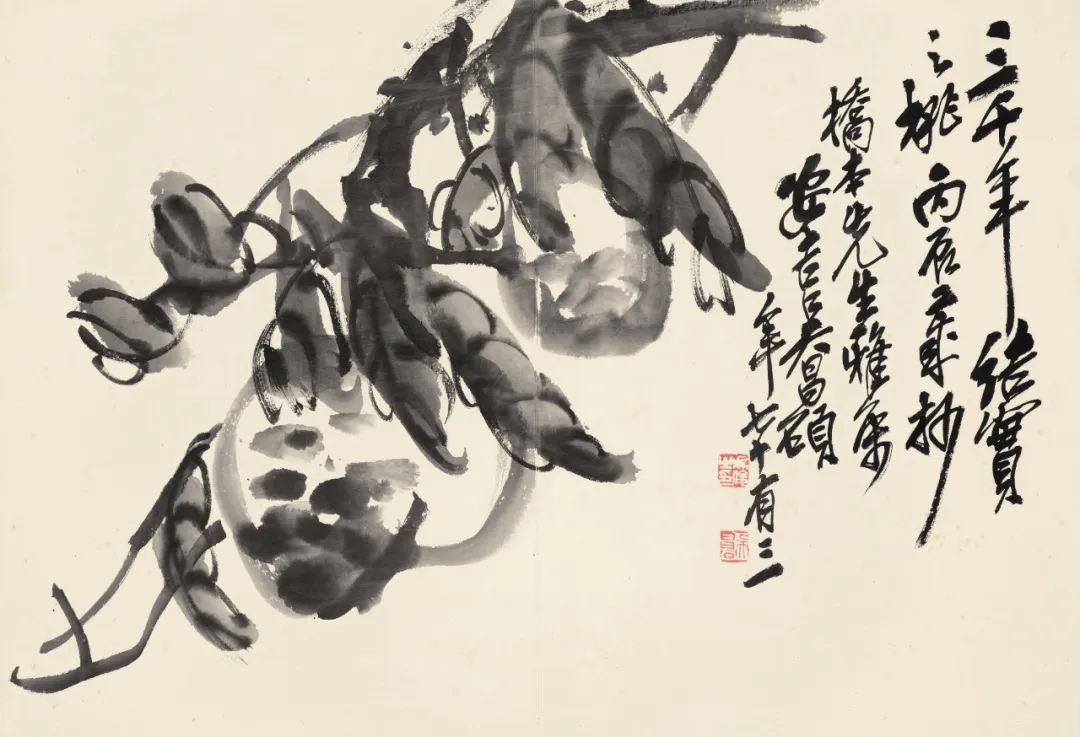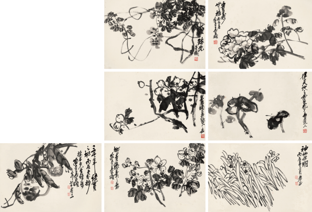 4.神仙作朋。丙辰春三月,老缶。印文:吴俊之印、吴昌石5.拟青藤笔意,安吉吴昌硕。印文:吴俊之印、吴昌石7.三千年结实之桃。丙辰年杪,桥本先生雅属。安吉吴昌硕年七十有三。印文:吴俊之印、吴昌石"【说明】上款「桥本」先生即桥本关雪(1883-1945),日本大正、昭和年间关西画派领袖。生于神户,小名成常、后改名关一。其父桥本海关为旧明治藩的儒家,擅长汉学、诗文,善于鉴赏古字画,与中国政客文人康有为、郑孝胥、罗振玉、吴昌硕等人交往密切。吴昌硕和桥本关雪的交流从何开始,尚不明。1911年,当年28岁的关雪跟随其父海关(1852-1935)前往中国。桥本海关在上海拜访了吴昌硕。那时,关雪有没有一同去拜访吴昌硕不得而知,但之前应该注意过吴昌硕之名。目前能够确定二人关系的作品,有1916年的33岁的桥本关雪委托吴昌硕的两件匾额和一件题字。一件匾额为篆书《隐居放言》,落款是「丙辰初秋,为桥本先生作篆。吴昌硕,时年七十有三」,另一件是篆书《雨奇晴好》,在落款处写着「桥本先生为书于海上。丙辰秋七月,吴昌硕老缶」。另外,吴昌硕还为《关雪散民画集》题了字。翌年,吴昌硕为桥本关雪写了《郁勃纵横》篆书横幅,现在该作品刻于白沙村庄关雪纪念馆庭院的中央,持佛堂前。1923年5月,吴昌硕与王一亭给关雪藏《倪元璐五言律诗》轴上写了跋文,同年10月,关雪参加在杭州西泠印社举办的「吴昌硕八十诞筵」,「和钱瘦铁君、春珊一起参加」,一天在西湖游玩,后乘车到留下,乘坐游览船。在从留下开往交芦庵寺庙的船上,「船不知何时正在黄柳和桑田中航行。阳光从水里反射的光,映在朝气蓬勃的春珊的脸上……」,于是钱瘦铁吟咏著:「舟过黄叶村」,关雪和唱着:「家在白花坞」,这让人联想到两位文人平日交往的场景。1924、1925年,桥本与吴昌硕也有会面,当年写吴昌硕给关雪的作品也流传至今。在《墨美》杂志的作品解说中,桥本归一引用关雪的话叙述「吴昌硕写字的时候,会在擂钵一样的东西中磨墨,然后把浸泡在里面的笔拿出来」,可以说是目睹了吴昌硕挥毫的珍贵感想。1916年前后开始,到吴昌硕去世的1927年的大约十年间,二人的交流一直持续着。1922年以后,桥本每次来中国时给他做翻译兼导游接待他的是钱瘦铁,以及他的朋友唐吉生等。