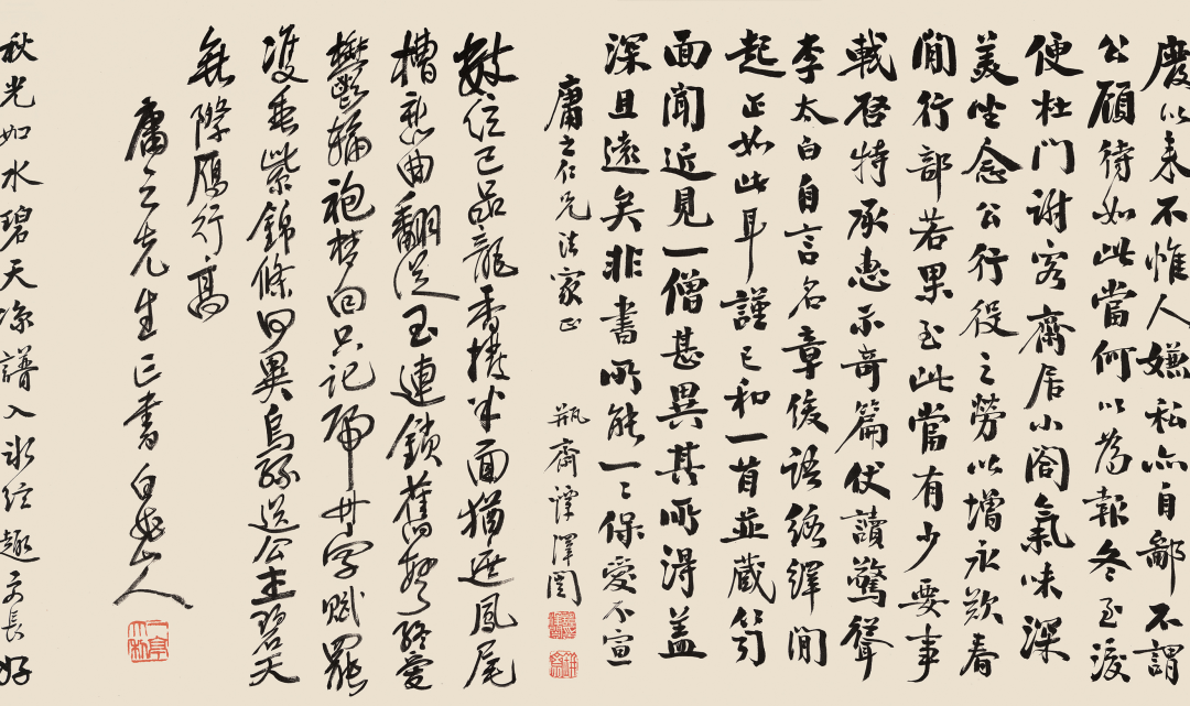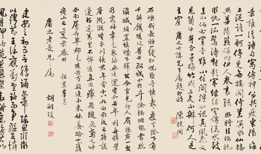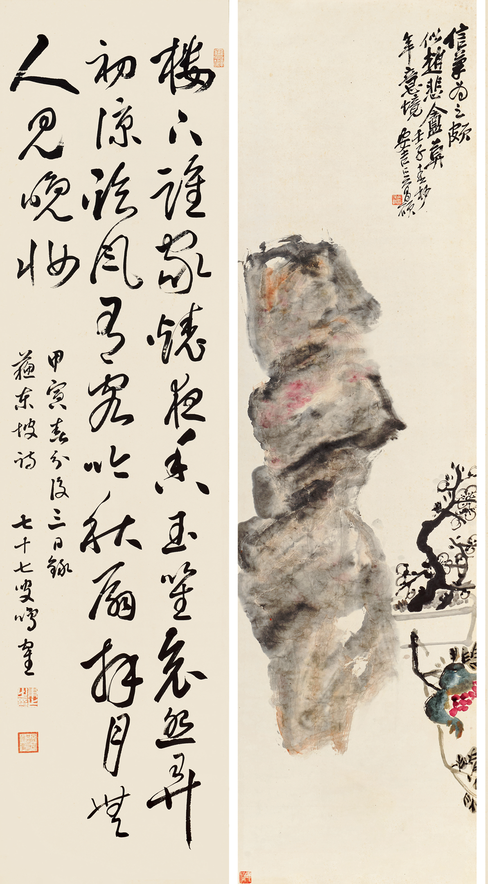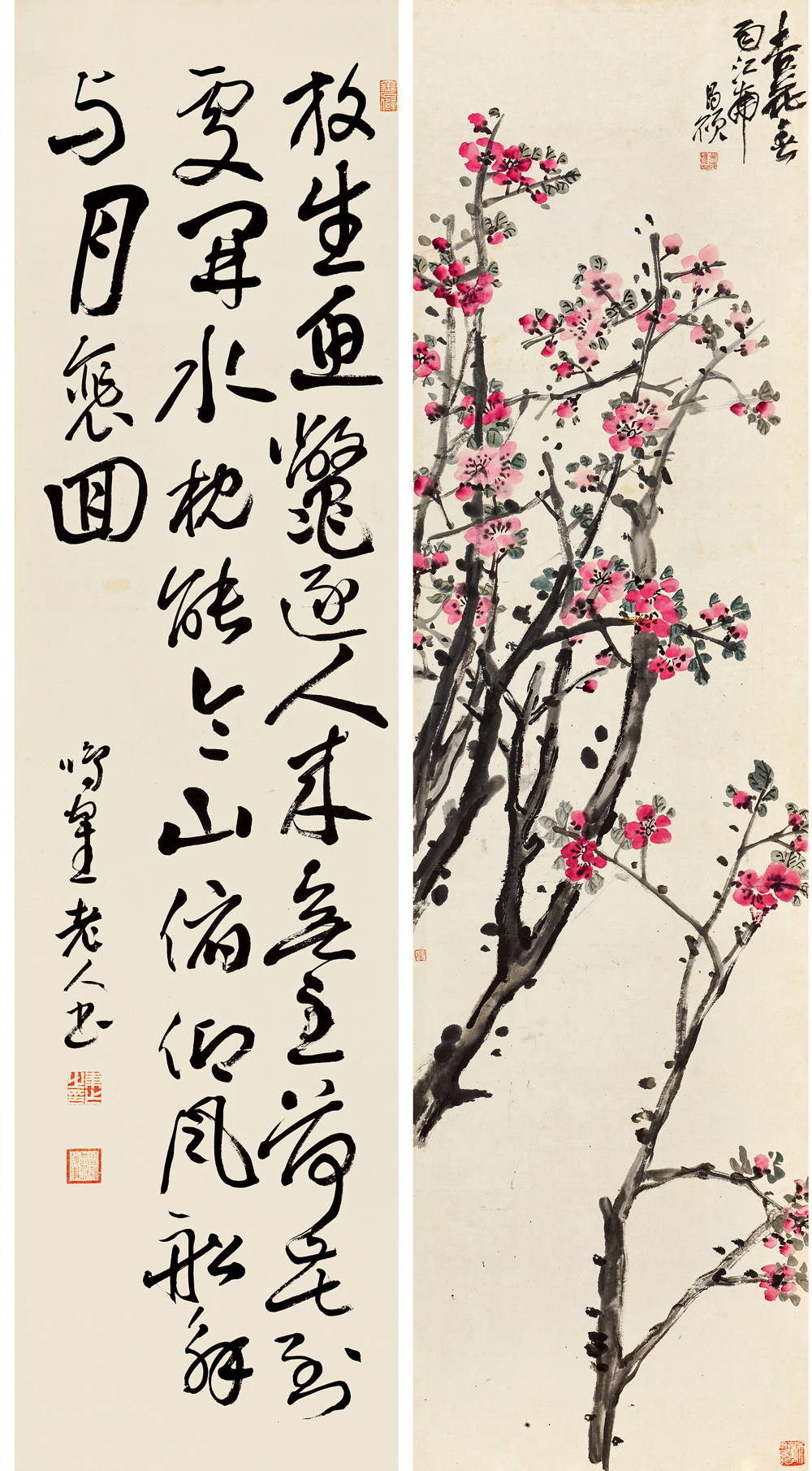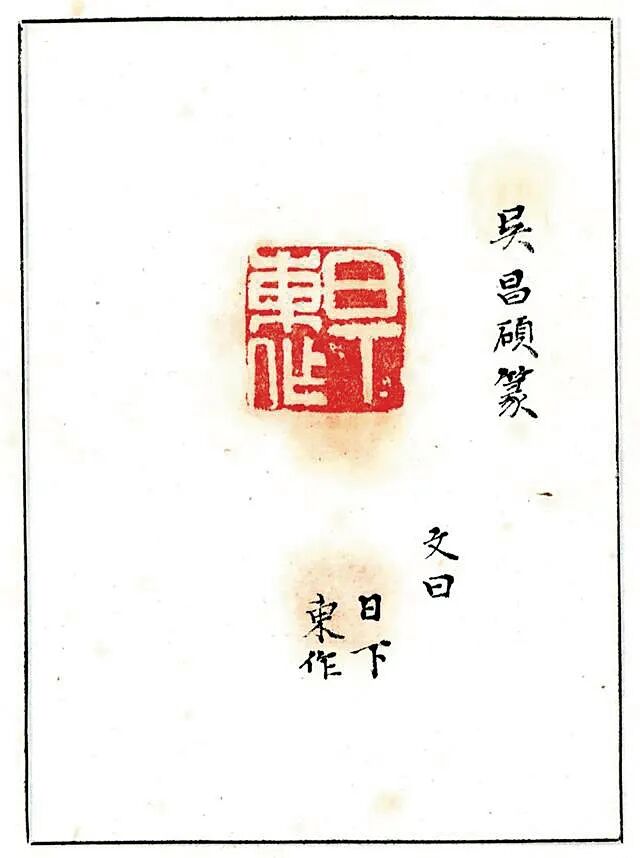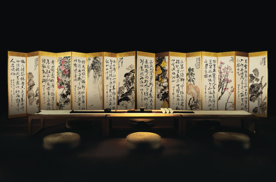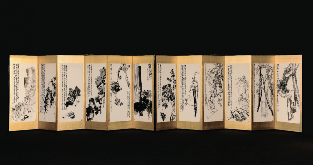 Kotake)、严谷一六并称「明治三笔」。鸣鹤与明治年间访日的杨守敬友善,从其习书及金石学,从此开创北碑书风,彪炳日本书坛数十年。除杨守敬外,鸣鹤亦与吴大澄、杨见山等中国金石学家颇有往来。吴昌硕与日下部鸣鹤两人相识于1891年。该年,鸣鹤来中国探访王羲之遗迹,并在沪浙地区拜访同道,与吴昌硕结交便在此间,二人或有会面,五月时,吴昌硕治印「日下东作」相赠,边款曰:「鸣鹤先生大方家。辛卯五月,昌石吴俊」。吴昌硕治印「日下东作」相赠,边款曰:「鸣鹤先生大方家。辛卯五月,昌石吴俊」尽管吴昌硕要小他六岁,但鸣鹤相当敬佩吴昌硕的功力。他自谦浪得「东海书圣」虚名,赞誉吴昌硕堪比唐代草圣张旭。两位相差六岁的艺术家的交流谱写了一段艺坛佳话。归国后,日下部鸣鹤向学生和朋友大力推崇吴昌硕艺术,成为缶墨东游传播第一人。之后的百余年间,鸣鹤学生河井荃庐等日本知名书画名家更是来到中国各地和西泠印社,追寻吴昌硕的脚步,钻研中国金石之学。鸣鹤对吴氏印作激赏不已,请其治印多枚,吴昌硕曾有诗句相赠,「冻梅寻伴侣,短札羡康疆」,二人情谊可见一斑。鸣鹤在日极力为吴氏宣扬,是最早在日本推广其艺术的重要人物。1922年,日下部鸣鹤辞世,吴昌硕为其墓碑篆额,以致哀思。今日杭州西泠印社观乐楼前有两人结交一百周年纪念碑,这段情谊亦可作金石寿了。吴昌硕的艺术赢得了众多日本藏家的青睐。日本藏的吴昌硕作品大多是四尺条幅,这与日本建筑结构有关,因为几乎每家每户都建有「画龛」以备挂书画作品,高度、宽度正好适合四尺条。还有一种格别,就是煎茶道的茶室,他们会挂一些超巨幅的书画作品,比如曾流行过挂王铎、张瑞图、倪元璐、黄道周、傅山等巨幅超长作品。尽管建筑偏低矮,只能展现出一个局部,但足显主人的气派了。还有就是日式双屏这样的豪华形式。所以,在日本偶尔也会有一些巨幅吴昌硕作品的收藏。如在北京保利拍卖2017年秋季拍卖会中2.093亿成交的吴昌硕《花卉十二屏》,便是极为特别的吴昌硕巨制。吴昌硕《花卉十二屏》北京保利拍卖2017年秋季拍卖会中2.093亿成交此套吴昌硕与日下部鸣鹤的书画合璧屏风与吴昌硕《花卉十二屏》相同形制,含日式八曲屏风一对。其中,吴昌硕1912年用赵之谦笔意,作芭蕉、杏花、凤仙、葫芦、荷花、幽兰、芙蓉、梅花八种。吴昌硕笔墨设色重、拙、大,金石味道十足。用墨浓淡干湿,各得其宜,表现出物象的内在气质和生命力。画中葫芦悬空摇曳,富贵之气溢于纸上;芙蓉碧红花绿叶,艳而不俗;杏花枝干以篆籀入画,抑扬顿挫,金石味极浓;幽兰则用行草笔法,活泼流畅,松动飘逸;荷叶以大笔饱墨挥写,依枝干之势,上下错落,浓淡相生,元气淋漓;芭蕉用墨清淡,干湿适度,极富神韵;凤仙花用没骨法画成,施以署红,用色沈稳,素雅清高;铁骨红梅金石气纵横,老辣苍劲,气象峥嵘。每幅各以行书题写诗句,或长或短,依画面布局精心安排。此套屏风展示出缶翁厚积薄发的绘画功力施墨浑厚沈稳,浓淡干湿,怡然自得,得花木之形,亦特具墨华韵致,设色点红嫣然,辅以嫩绿点染,颜色更加沈稳,营造出古雅酣畅的意韵。日下部鸣鹤1914年行书苏轼诗于对扇,每帧皆近五尺高,再裱于金底屏风,清华与金屏两相辉映,灿然一堂。观此屏风形八曲一双、两对并置之形制,非日常家中所用。应由当时一位钟情金石书画、崇敬苏东坡之藏家定制。可请得中日两位顶级金石家之墨迹组为一屏,亦非寻常人可达成之事。