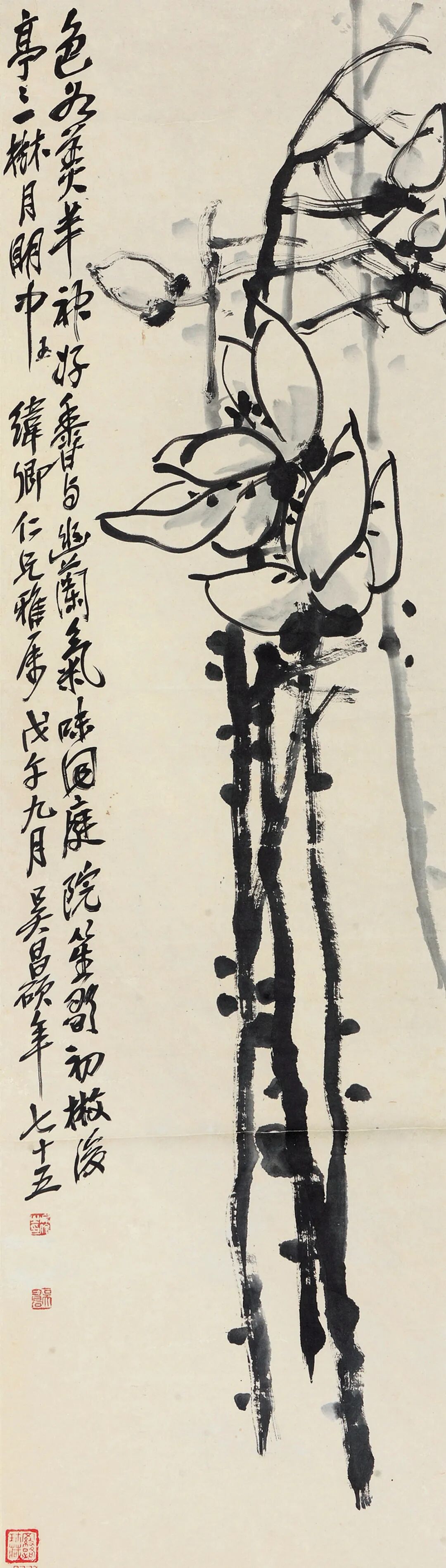 【题识】色如美玉丰神好,香与幽兰气味同。庭院笙歌初散后,亭亭一树月明中。纬卿仁兄雅属,戊午九月,吴昌硕年七十五![]()