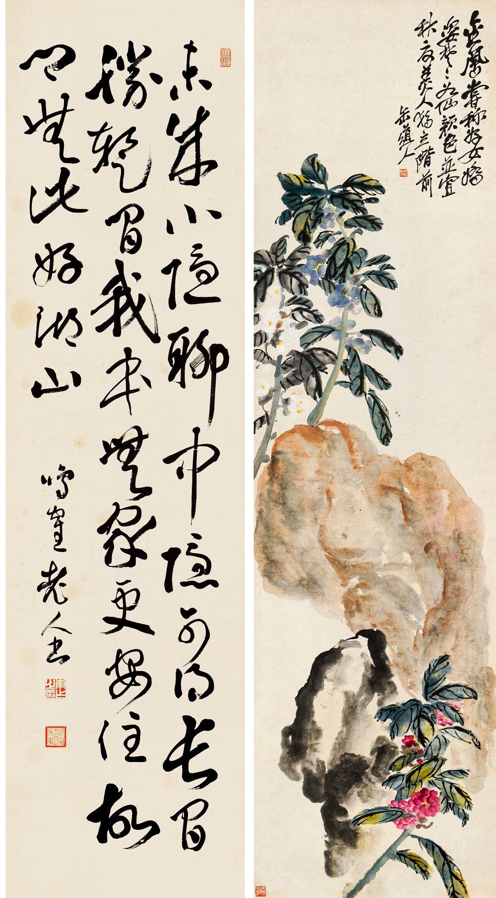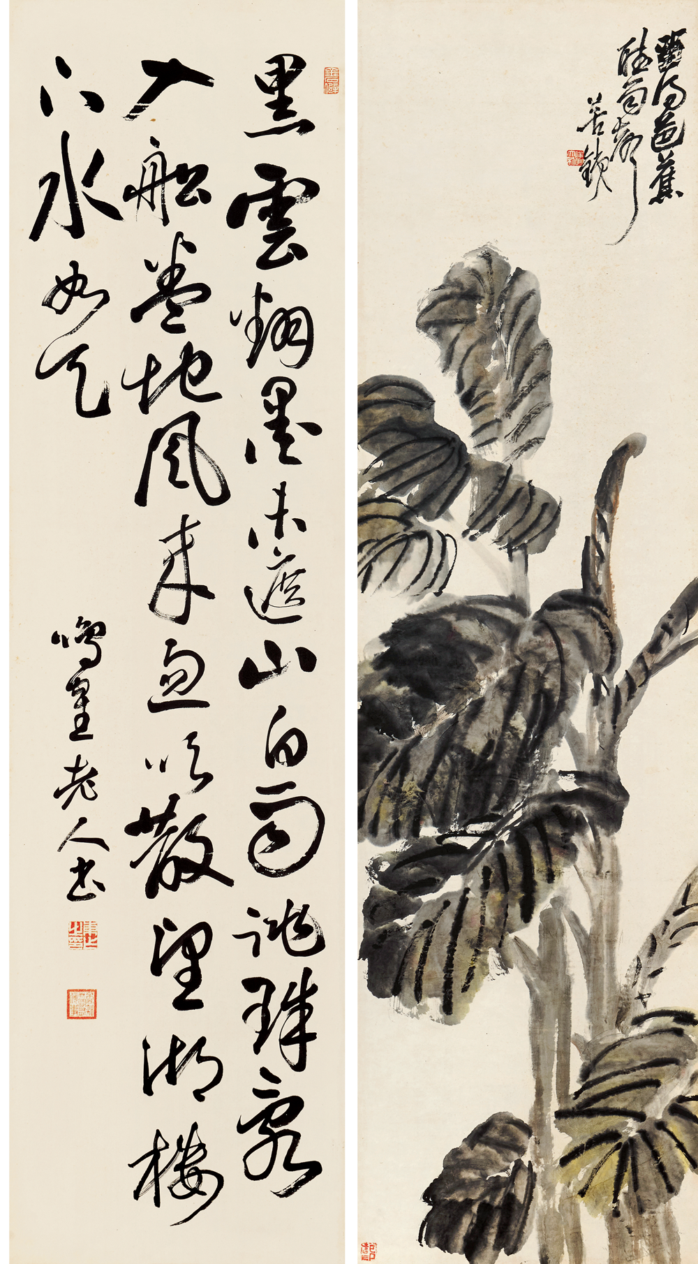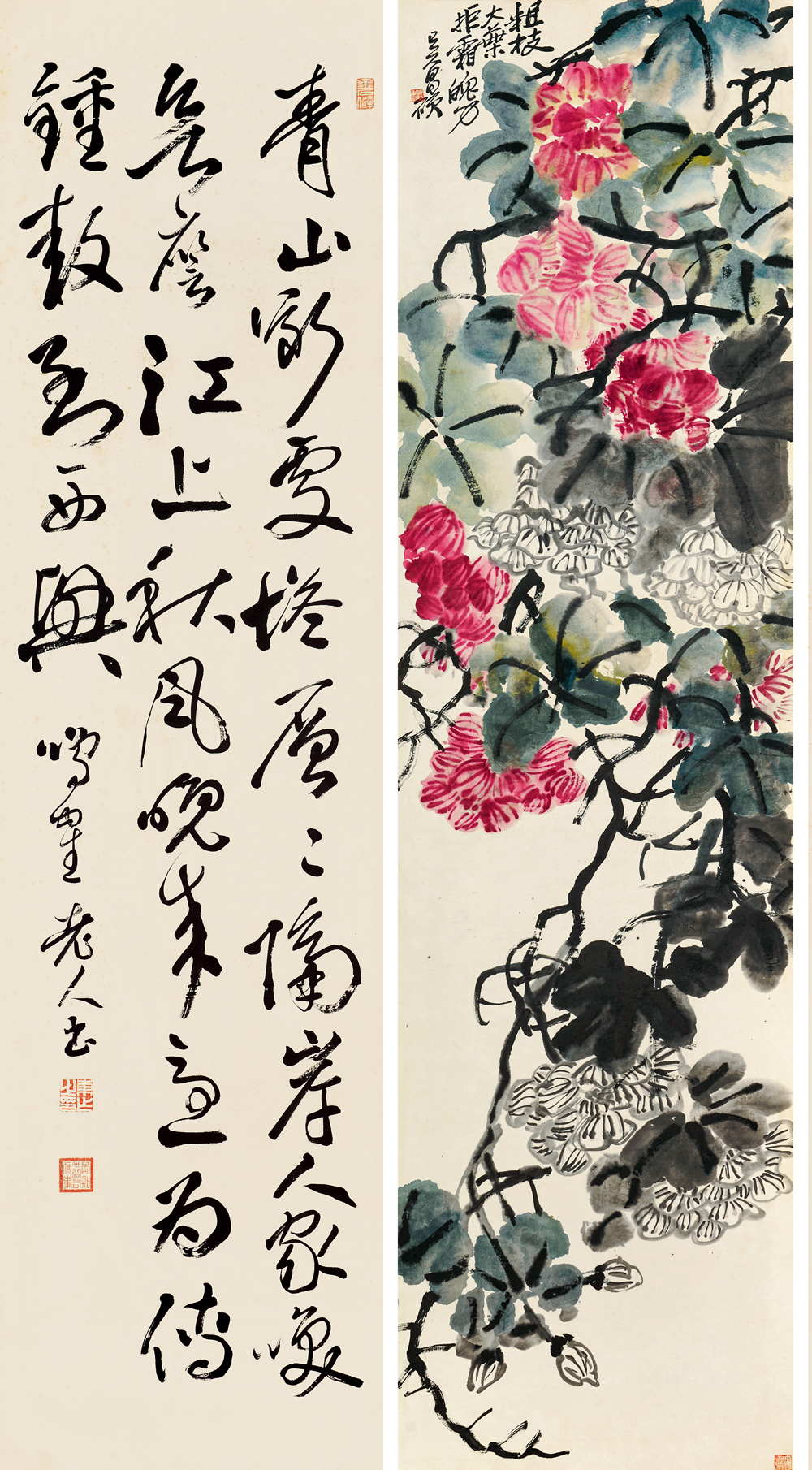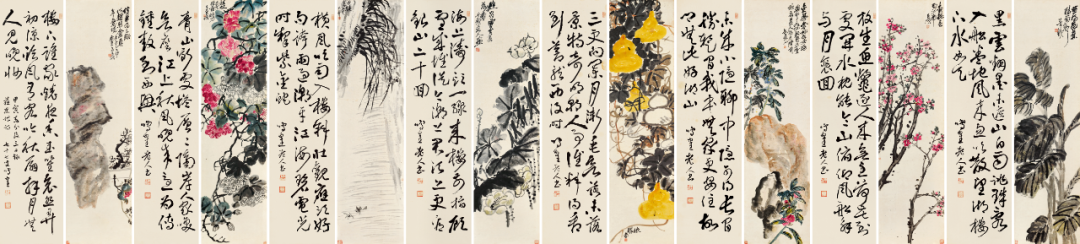 在近现代中国书画史上,作为「后海派」的代表画家,一代宗师吴昌硕的光芒无疑是最为耀眼的。而「海上画派」这个同上海1843年开埠以后一起成长起来的画派给当时充盈着陈词滥调的清末画坛带来一丝清新的「海风」。在吴昌硕的晚年,随着西方文化和教育体制的挑战,和受西方文化影响的新文化运动的冲击,传统艺术的基础动摇了,吴昌硕继续实践传统绘画被赋予了一种更为公众的甚至民族的特性,吴昌硕的金石气可以看作中国文人画传统的最后的荣光。在中国新旧文化交替的历史背景下,吴昌硕是对传统中国文化的继承和创新的关键人物,是金石画风从晚清过渡到民国的主要继承者,也是近现代中国艺坛承前启后的一代巨匠,其地位与影响力没有人能与之相比。吴昌硕及吴门一派的书画家成为上海和中国画坛的主流,形成「家家昌硕,人人缶翁」的局面。吴昌硕 1844-1927、日下部鸣鹤 1838-1922 花卉书法屏风150.5×40.3 cm×16 约5.5 平尺(每幅)估价:RMB 7,000,000-8,000,0001.《芭蕉图》 题识:留得芭蕉听雨声。苦铁。印文:俊卿大利、记印2.《行书苏轼〈六月二十七日望湖楼醉书其一〉》释文:黑云翻墨未遮山,白雨跳珠乱入船。卷地风来忽吹散,望湖楼下水如天。题识:鸣鹤老人书。印文:东作之印、否知世间有何事、金石僻3.《杏花图》题识:杏花春雨江南。昌硕。印文:吴俊唯印、聋、吴昌硕壬子岁以字行4.《行书苏轼〈六月二十七日望湖楼醉书其二〉》释文:放生鱼鳖逐人来,无主荷花到处开。水枕能令山俯仰,风船解与月裴回。题识:鸣鹤老人书。印文:东作之印、否知世间有何事、金石僻5.《凤仙花石图》题识:金凤尝称好女,娇姿楚楚如仙。颜色并宜秋夏,美人独立阶前。缶道人。印文:安吉吴俊昌石、缶无咎6.《行书苏轼〈六月二十七日望湖楼醉书其五〉》释文:未成小隐聊中隐,可得长闲胜暂闲。我本无家更安住,故乡无此好湖山。题识:鸣鹤老人书。印文:东作之印、否知世间有何事、金石僻7.《葫芦图》题识:依样。缶。印文:安吉吴俊卿之章8.《行书苏轼〈夜冷西湖五绝其二〉》释文:三更向阑月渐垂,欲落未落景特奇。明朝人事谁料得,看到苍龙西没时。题识:鸣鹤老人书。印文:东作之印、否知世间有何事、金石僻9.《荷花图》题识:避炎曾坐芰荷香。苦铁道人画。印文:安吉吴俊章、吴昌硕壬子岁以字行10.《行书苏轼〈望湖楼晚景五绝其一〉》释文:海上涛头一线来,楼前指顾雪成堆。从今潮上君须上,更看银山二十回。题识:鸣鹤老人书。印文:东作之印、否知世间有何事、金石僻11.《幽兰图》题识:香骚遗意。大聋。印文:苦铁近况、吴俊卿印12.《行书苏轼〈望湖楼晚景五绝其二〉》释文:横风吹雨入楼斜,壮观应须好句夸。雨过潮平江海碧,电光时掣紫金蛇。题识:鸣鹤老人书。印文:东作之印、否知世间有何事、金石僻13.《芙蓉花图》题识:粗枝大叶,拒霜魄力。吴昌硕。印文:安吉吴俊昌石、缶无咎14.《行书苏轼〈望湖楼晚景五绝其三〉》释文:青山断处塔层层,隔岸人家唤欲应。江上秋风晚来急,为传钟鼓到西兴。题识:鸣鹤老人书。印文:东作之印、否知世间有何事、金石僻15.《梅石图》题识:信笔为之,颇似赵悲盦暮年意境。壬子(1912年)春杪,安吉吴昌硕。印文:吴俊卿印、破荷16.《行书苏轼〈望湖楼晚景五绝其四〉》释文:楼下谁家烧夜香,玉笙哀怨弄初凉。临风有客吟秋扇,拜月无人见晚妆。题识:甲寅春分后三日录苏东坡诗,七十七叟鸣鹤。印文:东作之印、否知世间有何事、金石僻【注】此件作品的交接地点为中国香港,具体信息请联系北京保利拍卖中国书画部工作人员。