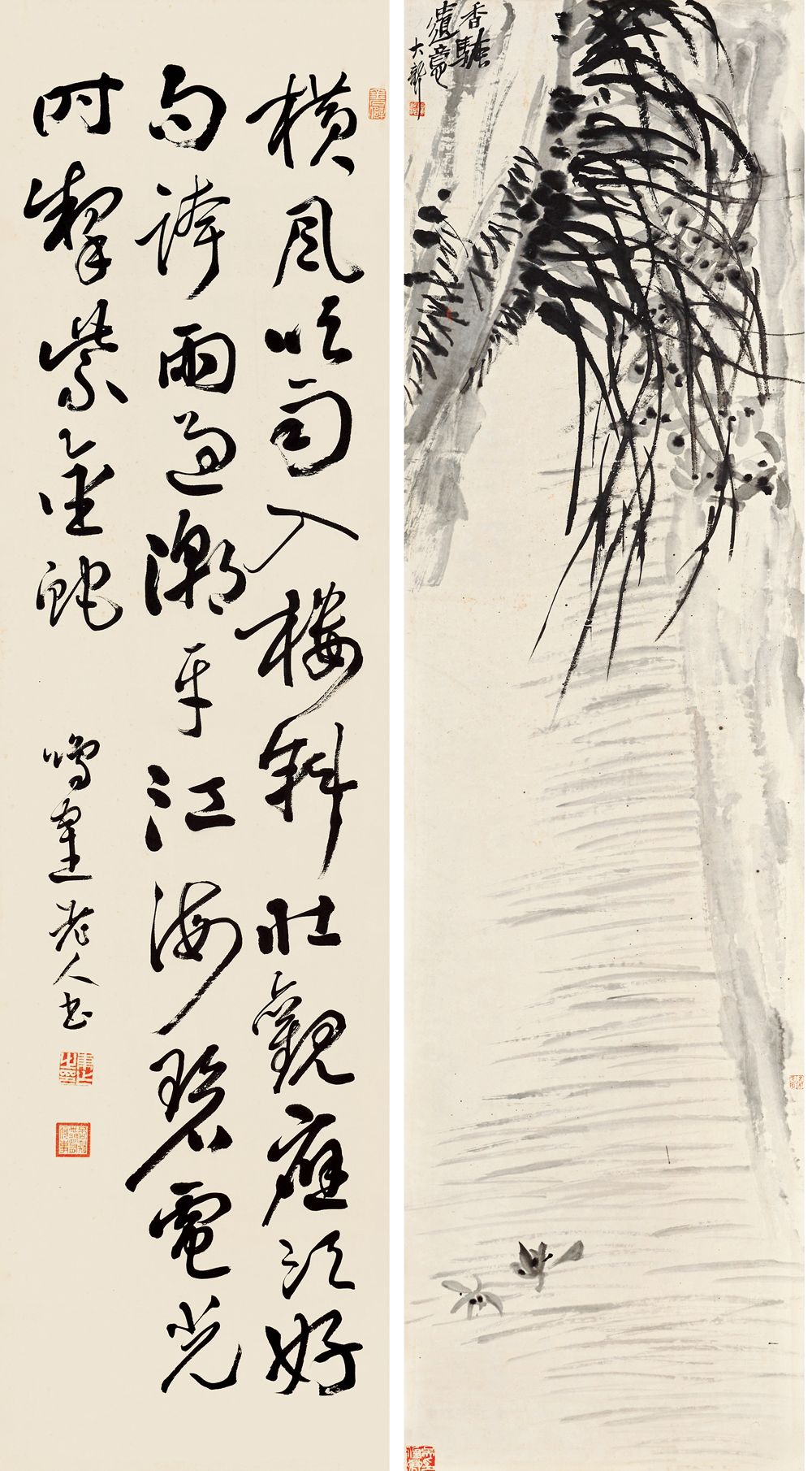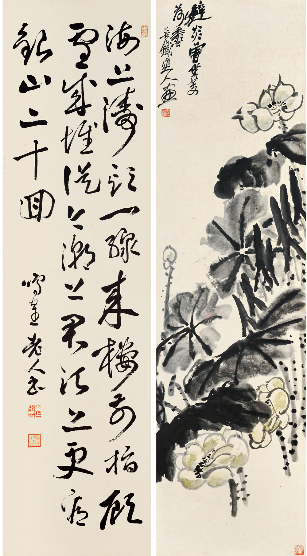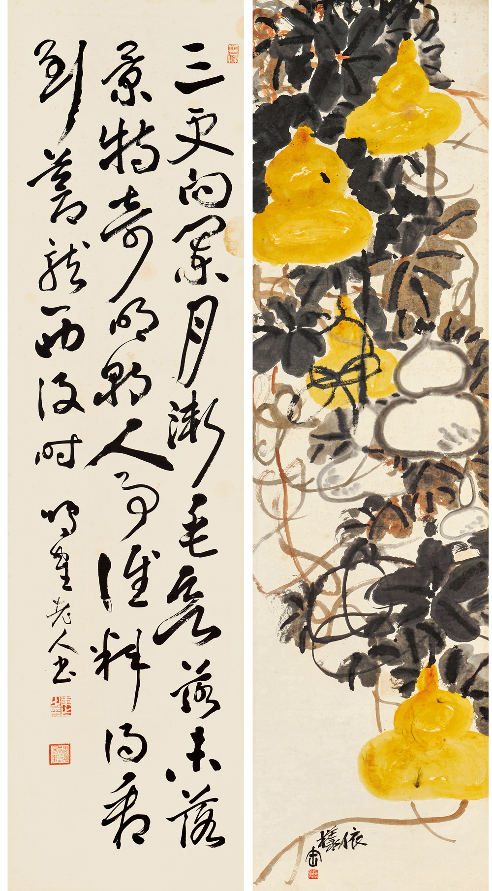 在近现代中国书画史上,作为「后海派」的代表画家,一代宗师吴昌硕的光芒无疑是最为耀眼的。而「海上画派」这个同上海1843年开埠以后一起成长起来的画派给当时充盈着陈词滥调的清末画坛带来一丝清新的「海风」。在吴昌硕的晚年,随着西方文化和教育体制的挑战,和受西方文化影响的新文化运动的冲击,传统艺术的基础动摇了,吴昌硕继续实践传统绘画被赋予了一种更为公众的甚至民族的特性,吴昌硕的金石气可以看作中国文人画传统的最后的荣光。在中国新旧文化交替的历史背景下,吴昌硕是对传统中国文化的继承和创新的关键人物,是金石画风从晚清过渡到民国的主要继承者,也是近现代中国艺坛承前启后的一代巨匠,其地位与影响力没有人能与之相比。吴昌硕及吴门一派的书画家成为上海和中国画坛的主流,形成「家家昌硕,人人缶翁」的局面。吴昌硕 1844-1927、日下部鸣鹤 1838-1922 花卉书法屏风150.5×40.3 cm×16 约5.5 平尺(每幅)估价:RMB 7,000,000-8,000,0001.《芭蕉图》 题识:留得芭蕉听雨声。苦铁。印文:俊卿大利、记印2.《行书苏轼〈六月二十七日望湖楼醉书其一〉》释文:黑云翻墨未遮山,白雨跳珠乱入船。卷地风来忽吹散,望湖楼下水如天。题识:鸣鹤老人书。印文:东作之印、否知世间有何事、金石僻3.《杏花图》题识:杏花春雨江南。昌硕。印文:吴俊唯印、聋、吴昌硕壬子岁以字行4.《行书苏轼〈六月二十七日望湖楼醉书其二〉》释文:放生鱼鳖逐人来,无主荷花到处开。水枕能令山俯仰,风船解与月裴回。题识:鸣鹤老人书。印文:东作之印、否知世间有何事、金石僻5.《凤仙花石图》题识:金凤尝称好女,娇姿楚楚如仙。颜色并宜秋夏,美人独立阶前。缶道人。印文:安吉吴俊昌石、缶无咎6.《行书苏轼〈六月二十七日望湖楼醉书其五〉》释文:未成小隐聊中隐,可得长闲胜暂闲。我本无家更安住,故乡无此好湖山。题识:鸣鹤老人书。印文:东作之印、否知世间有何事、金石僻7.《葫芦图》题识:依样。缶。印文:安吉吴俊卿之章8.《行书苏轼〈夜冷西湖五绝其二〉》释文:三更向阑月渐垂,欲落未落景特奇。明朝人事谁料得,看到苍龙西没时。题识:鸣鹤老人书。印文:东作之印、否知世间有何事、金石僻9.《荷花图》题识:避炎曾坐芰荷香。苦铁道人画。印文:安吉吴俊章、吴昌硕壬子岁以字行10.《行书苏轼〈望湖楼晚景五绝其一〉》释文:海上涛头一线来,楼前指顾雪成堆。从今潮上君须上,更看银山二十回。题识:鸣鹤老人书。印文:东作之印、否知世间有何事、金石僻11.《幽兰图》题识:香骚遗意。大聋。印文:苦铁近况、吴俊卿印12.《行书苏轼〈望湖楼晚景五绝其二〉》释文:横风吹雨入楼斜,壮观应须好句夸。雨过潮平江海碧,电光时掣紫金蛇。题识:鸣鹤老人书。印文:东作之印、否知世间有何事、金石僻13.《芙蓉花图》题识:粗枝大叶,拒霜魄力。吴昌硕。印文:安吉吴俊昌石、缶无咎14.《行书苏轼〈望湖楼晚景五绝其三〉》释文:青山断处塔层层,隔岸人家唤欲应。江上秋风晚来急,为传钟鼓到西兴。题识:鸣鹤老人书。印文:东作之印、否知世间有何事、金石僻15.《梅石图》题识:信笔为之,颇似赵悲盦暮年意境。壬子(1912年)春杪,安吉吴昌硕。印文:吴俊卿印、破荷16.《行书苏轼〈望湖楼晚景五绝其四〉》释文:楼下谁家烧夜香,玉笙哀怨弄初凉。临风有客吟秋扇,拜月无人见晚妆。题识:甲寅春分后三日录苏东坡诗,七十七叟鸣鹤。印文:东作之印、否知世间有何事、金石僻【注】此件作品的交接地点为中国香港,具体信息请联系北京保利拍卖中国书画部工作人员。
