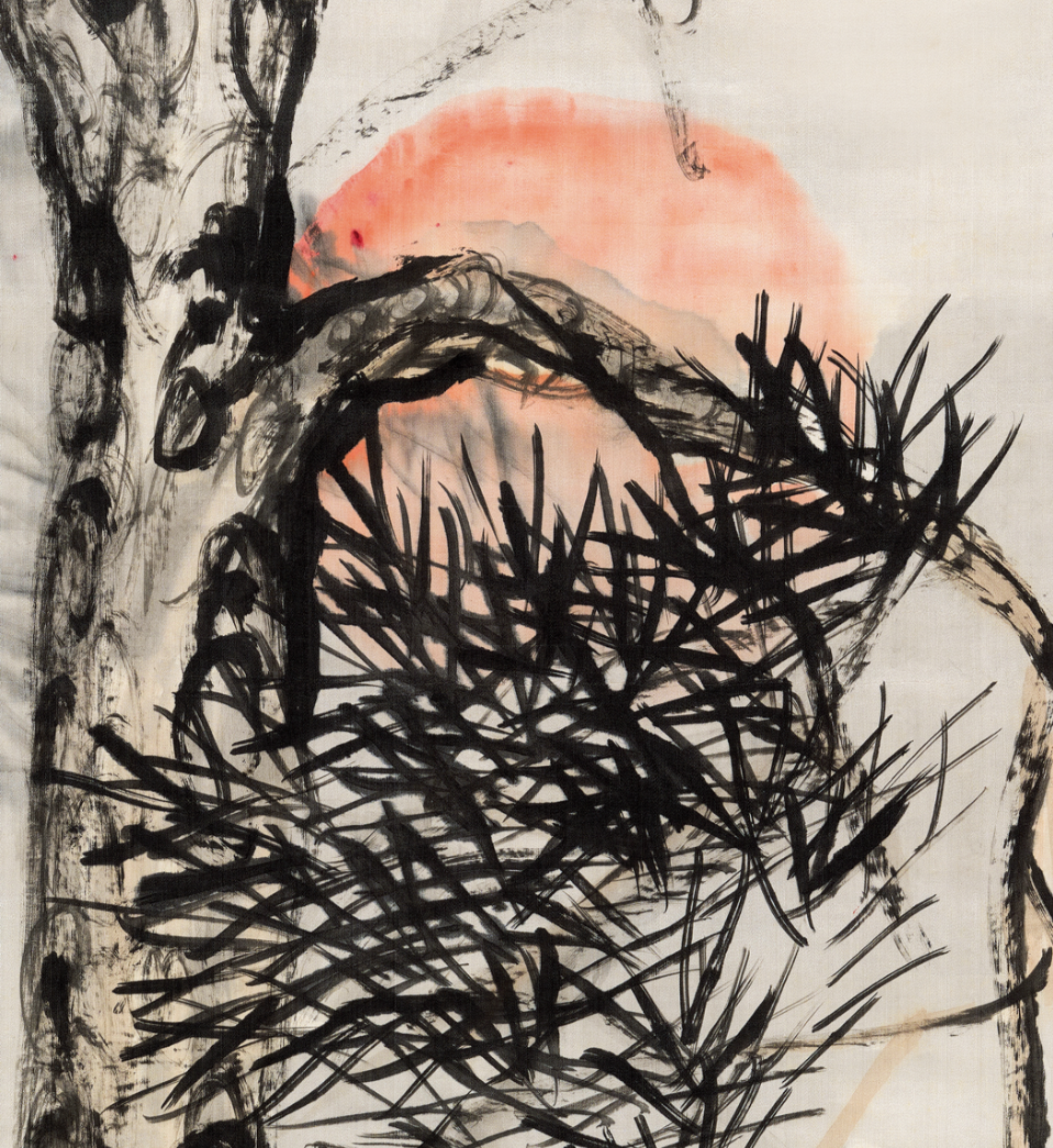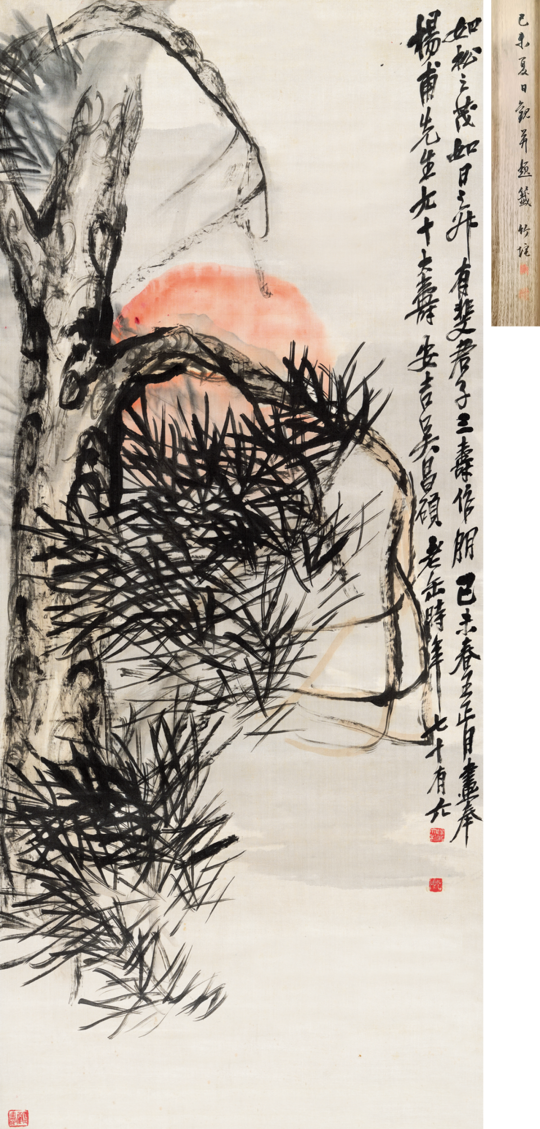 估价:RMB 1,800,000-2,800,000【题识】如松之茂,如日之升,有斐君子,三寿作朋。己未春王正月画奉杨甫先生九十大寿,安吉吴昌硕老缶时年七十有六。1.上款人「杨甫」应为杉山杨甫。杉山杨甫,长崎一家历史悠久的日式酒家「迎阳亭」的主人,「迎阳亭」自江户以来被政府官员以及夏目漱石等许多文化名人光顾。此幅《松旭寿图》为吴昌硕76岁所作,他画的松确有寒风骤至,真龙腾空的气概,总能体现出刚直不阿,昂首挺拔的气节。与其80岁以后所画的松作相比,多的是润泽、俊秀与挺拔。笔墨坚实,勾了之物恰似人的壮年。画面上一棵松不作屈曲,用浓墨深墨画松针、写鳞片,枝叶错落,有聚有散。背后升起的旭日,色泽温润,构图巧妙,似置身于山顶看到的日出,惟妙惟肖,一种「卓然而立」的气魄跃然纸面。益显郁勃古朴,苍劲浑雄,真可谓:笔端飒飒生清风,解衣盘礡吾画松,是时春暖冰初解,砚池墨水腾蛟龙。殊为难得之佳作。吴昌硕爱梅的坚强不屈,爱兰的孤高、淑静,爱竹的高风亮节,爱菊的凌寒傲霜,更爱松的不向秋风低头的顽强。这些皆源自他个人的品性与修养,与他高傲倔强的性格相吻合。此幅作品最为突出的是旭日的升起,用顶天立地的松加以衬托以求其势,「如松之茂,如日之升」此作为杨莆先生贺九十大寿所做,画面松树枝干盘曲,似虬龙伸展,寄托画家的浩然之气。虽乱头粗服,却气足墨酣,内藴深厚,多书法意味,富金石之气。其曾题诗云「笔端飒飒生清风,解衣盘礡吾画松。是时春暖冻初解,砚池墨水腾蛟龙。」深含「造化相通」的蓬勃之气。