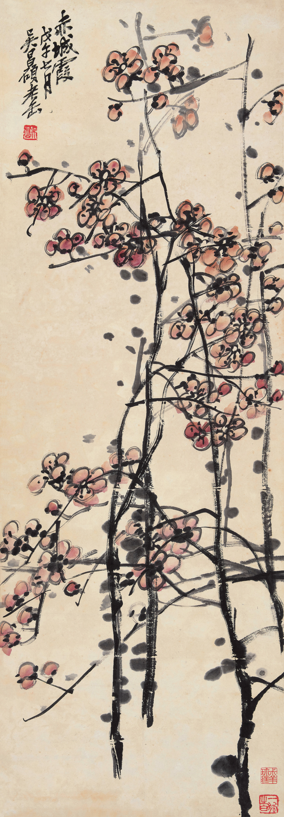 【题识】梅花标格,非秀雅之笔,不足传其神。近见画梅诸家非俗即霸,未免唐突,梅花矣。此仿丁野堂笔法。癸亥立夏,老缶。