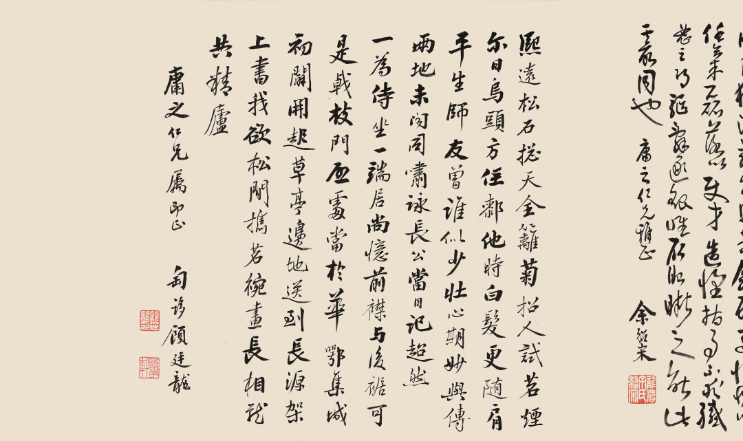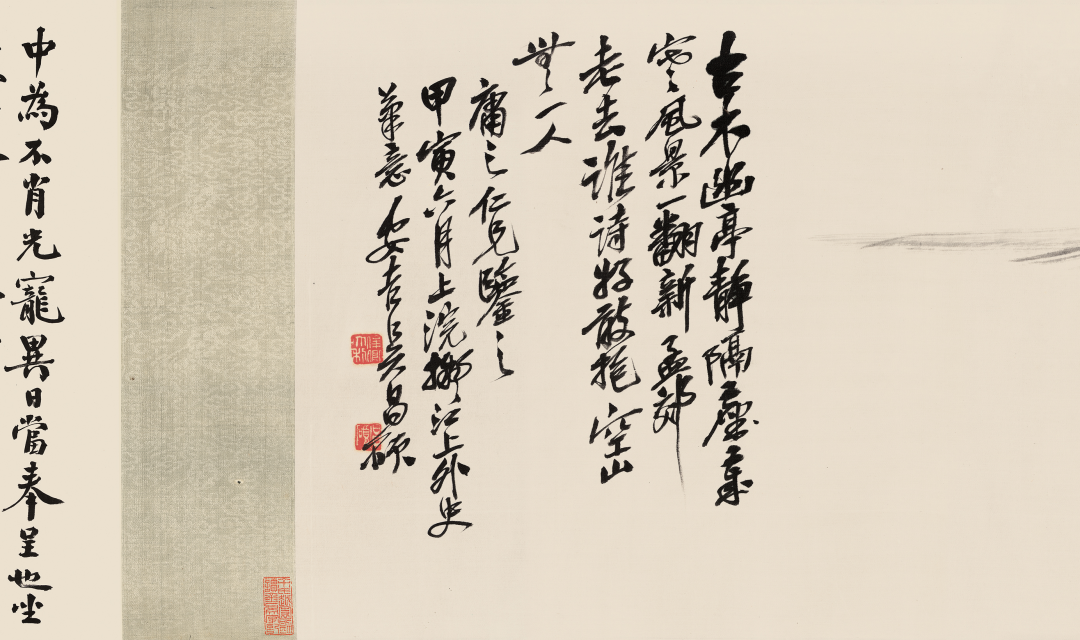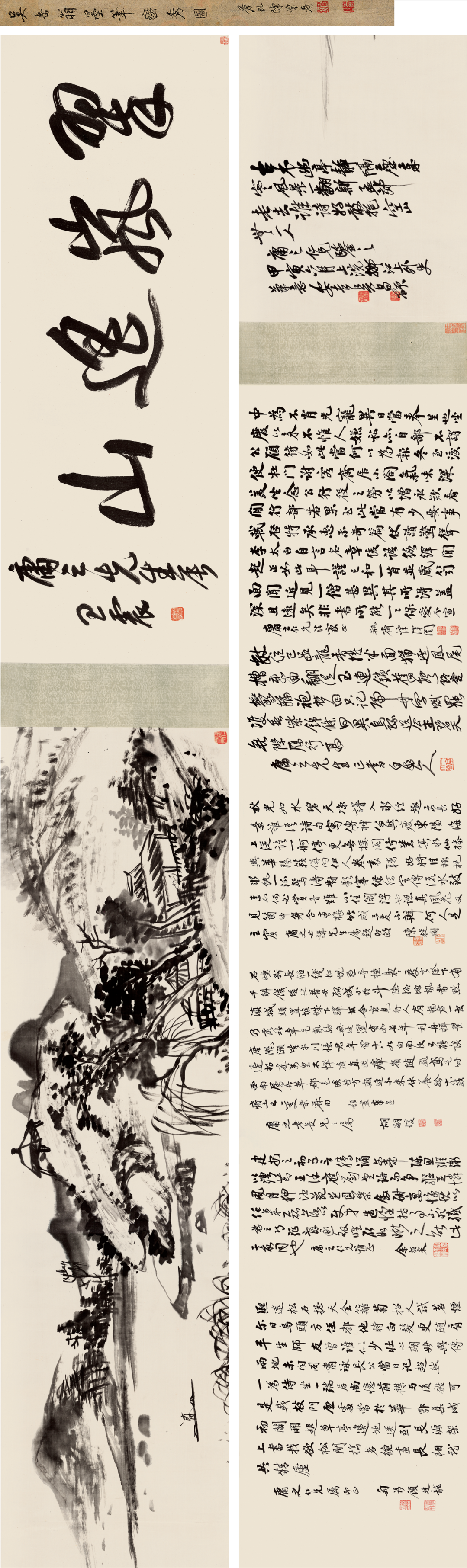 【题识】古木幽亭静隔尘,岁寒风景一翻新。孟郊老去谁诗好,敢抱空山无一人。庸之仁兄鉴之,甲寅六月上浣,拟江上外史笔意,安吉吴昌硕。【陈曾寿题签】吴缶翁墨笔峦秀图,苍虬陈曾寿。印文:苍虬【王一亭题引首】翠岚遥山。庸之先生属,王一亭。印文:苕溪王一亭长寿1. 庸之仁兄法家正,瓶斋谭泽闿。印文:谭泽闿印、瓶斋3. 庸之世讲先生属题即政,陈从周。印文:大风堂弟子、陈从周4. 题画奉庸之老长兄之属,胡嗣瑗。印文:臣胡嗣瑗、癸卯翰林6. 庸之仁兄属即正,匋誃顾廷龙。印文:顾廷龙印、晚学轩【说明】上款「庸之」先生应为孔祥熙(1880-1967),字庸之,号子渊,中国民国时期南京国民政府行政院长,兼财政部长。亦是一名银行家及富商。孔氏夫妇学养深厚,嗜好收藏。1947年,孔公移居美国,珍藏书画为孔氏家族传承。
