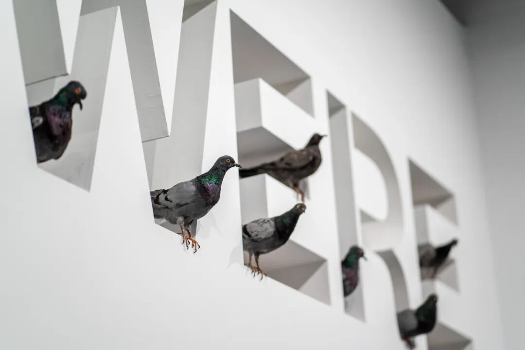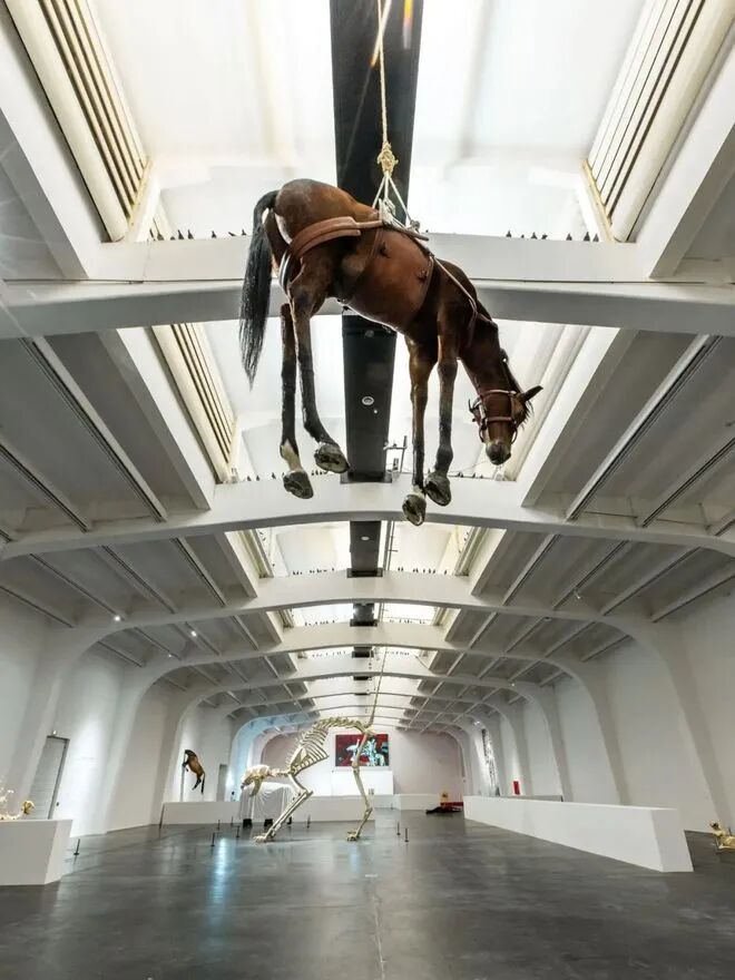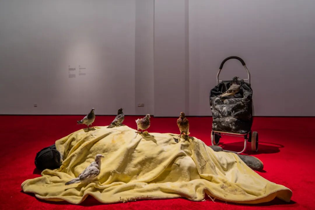 卡特兰系列作品中常见的动物标本和骨架也出现在了展览上,比如作品《小孩》(2021)、《无》(2021)和《无题》(1997),其中,鸽子标本在本次展出的不同作品中现身,并被艺术家赋予了多重意指,而叼着报纸的狗骨架则诉说了卡特兰对爱与信念力量的信仰。