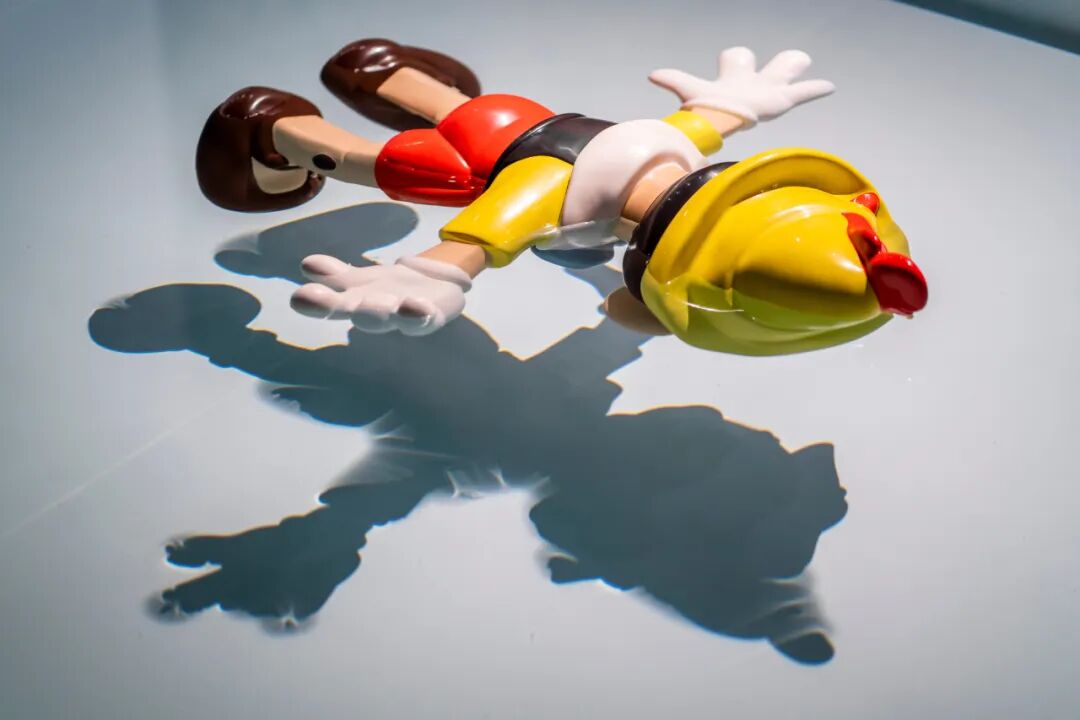 给作品缩小尺寸是卡特兰的众多“招数”之一,当身形变得迷你之后,仿佛也缩小了感受、情绪、恐惧以及快乐。作品《迷你的我》就如同它的名字——卡特兰将自己的形象做成装饰摆件,放在壁炉台面上,图书馆书架上,或是天花板吊顶上,漫不经心地低着头,仿佛在看观众或是盯着地面放空,时而面露忧伤,时而带着一丝沮丧。