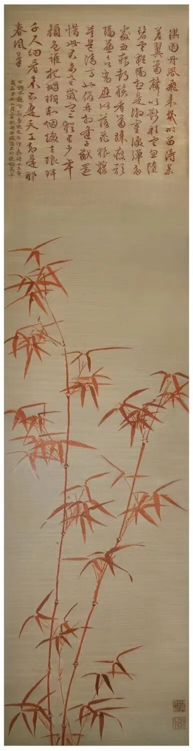 清乾隆御笔朱竹图轴图原作现藏于北京故宫博物馆,作品画面姿态潇洒,竹干的挺拔、节的梗脆、叶的阴阳向背都表现得十分真切,结构层次和空间处理的十分恰当,繁而不乱,疏密有致,笔笔清晰,无一笔虚设。