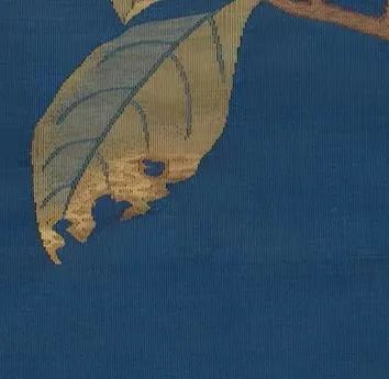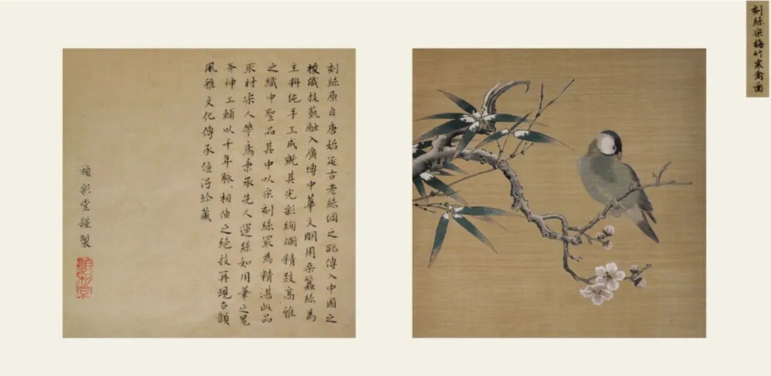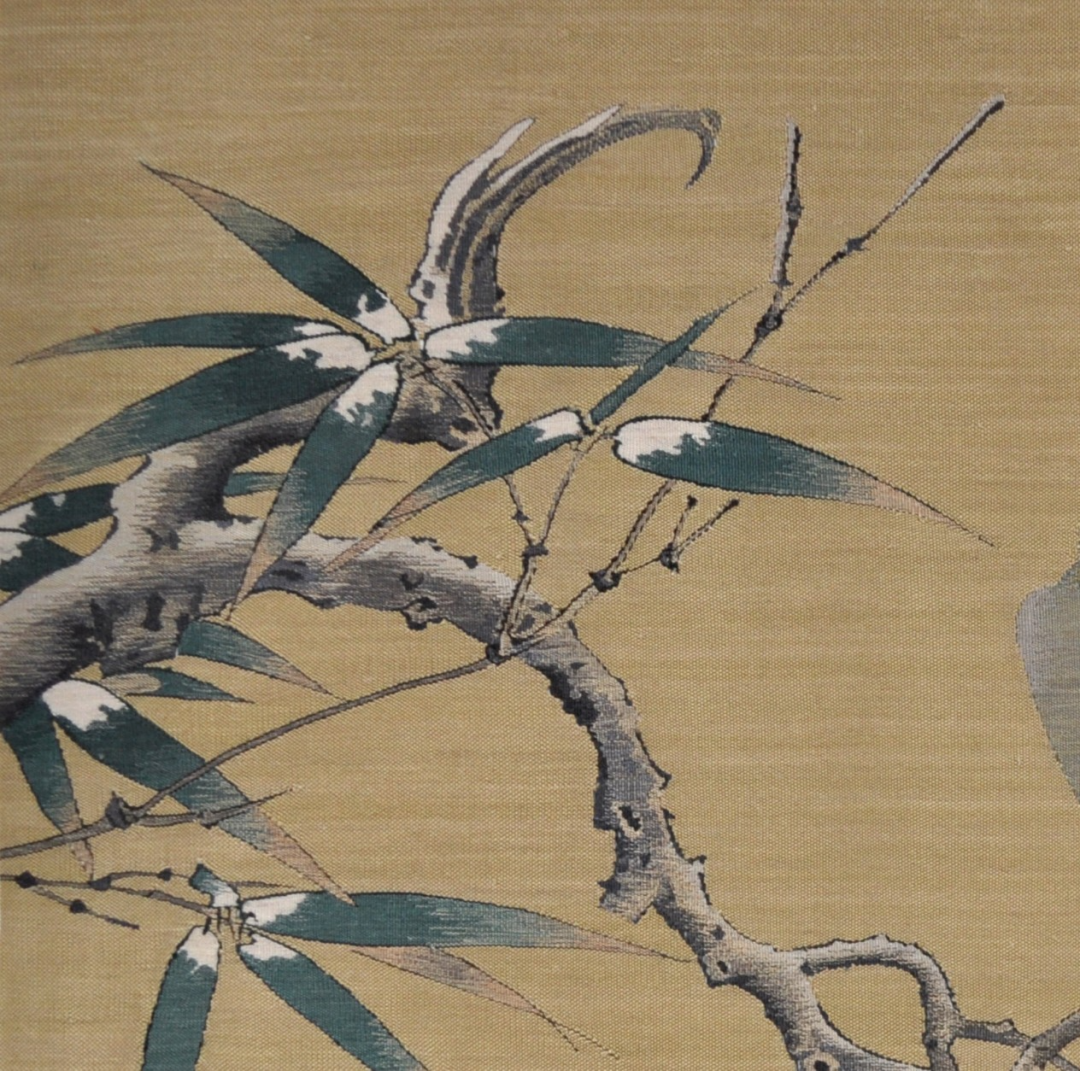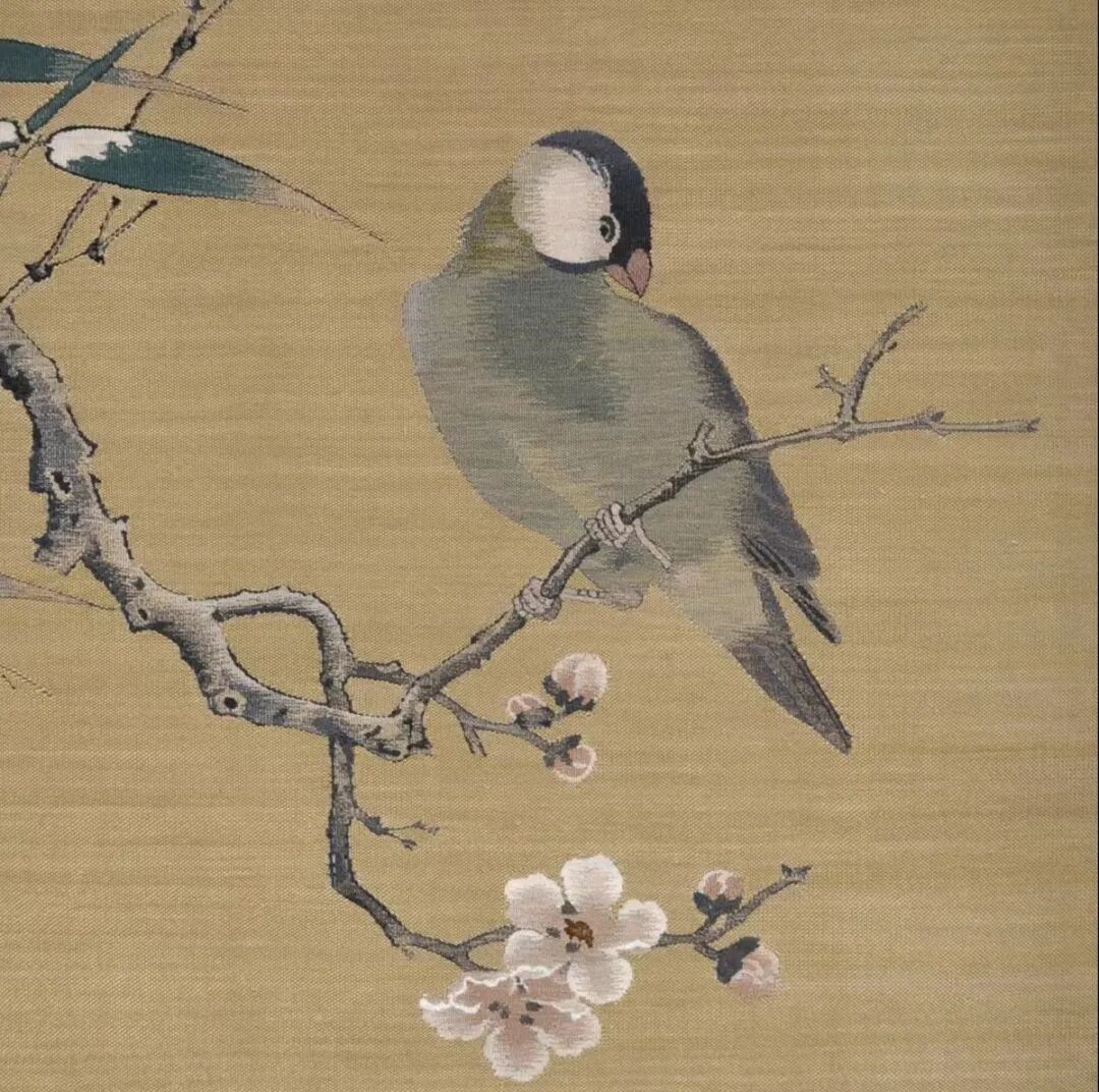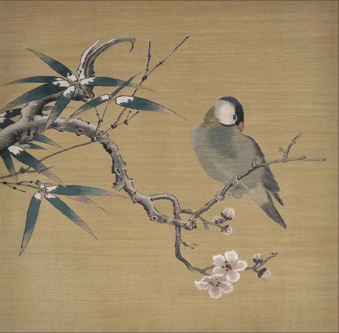 题材虽是宋画,但在缂织技巧上,富有新意,枝杆竹叶,勾勒有力,拼线戗色,过渡流畅;花和寒禽,墨骨技法,写意为主,轻重有度。充分体现绘画和缂丝之间的完美结合,方寸间现功底,是收藏级的佳作。