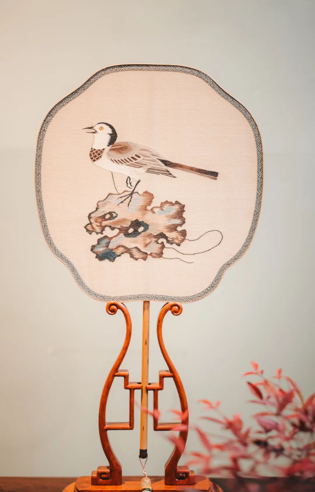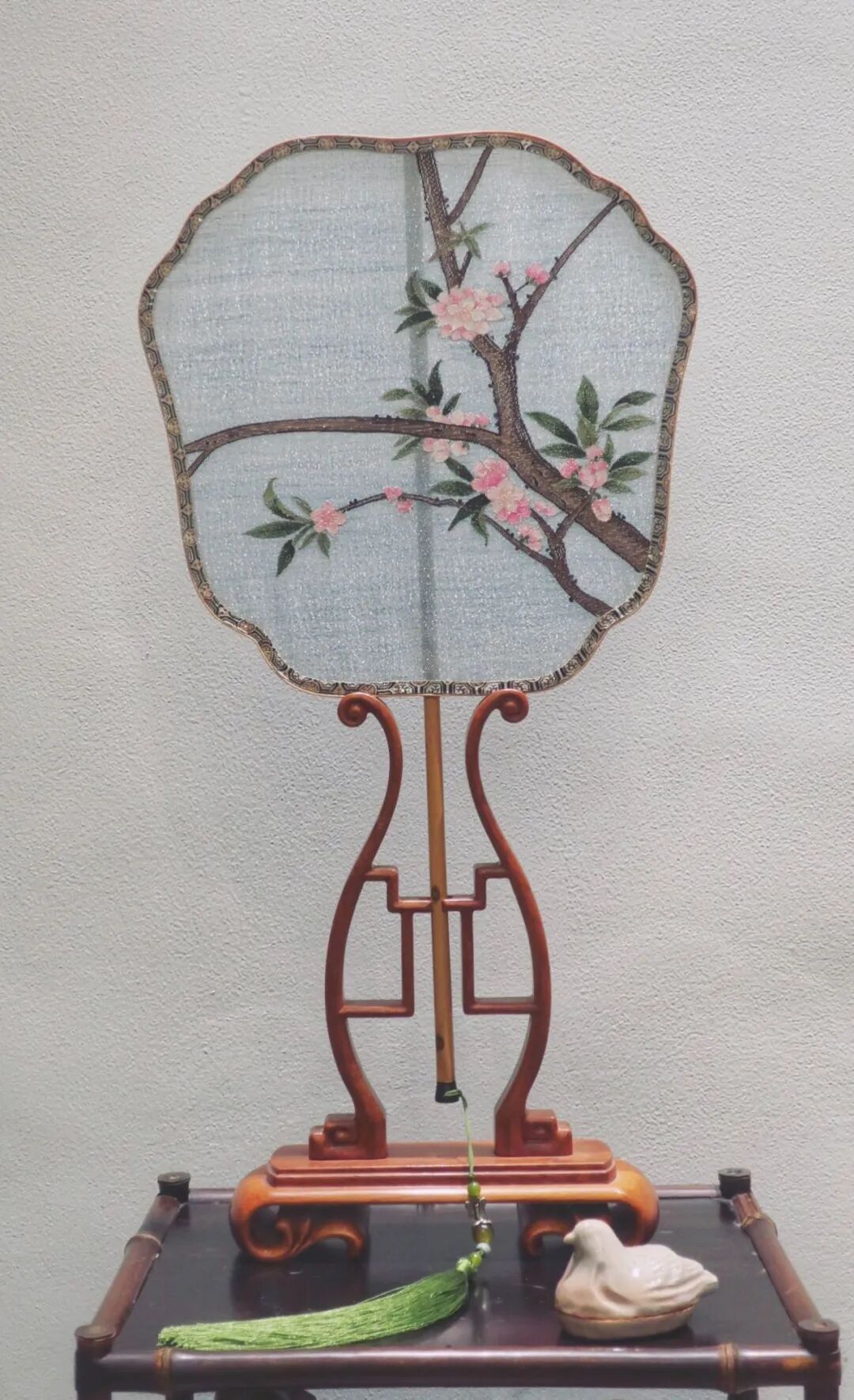 缂丝绣羽鸣春图团扇