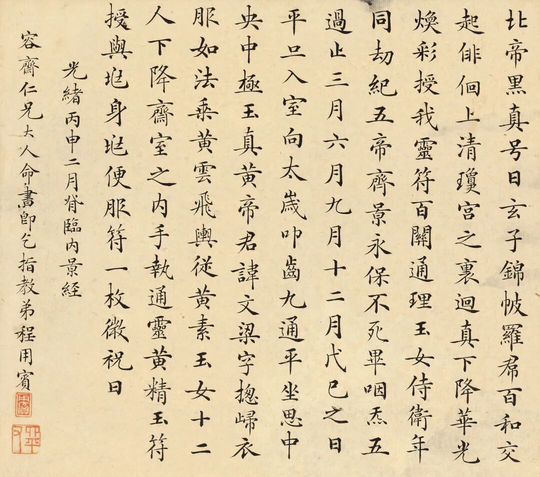 款识:光绪丙申(1896年)二月临内景经。容斋仁兄大人命书即乞指教,弟程用宾。