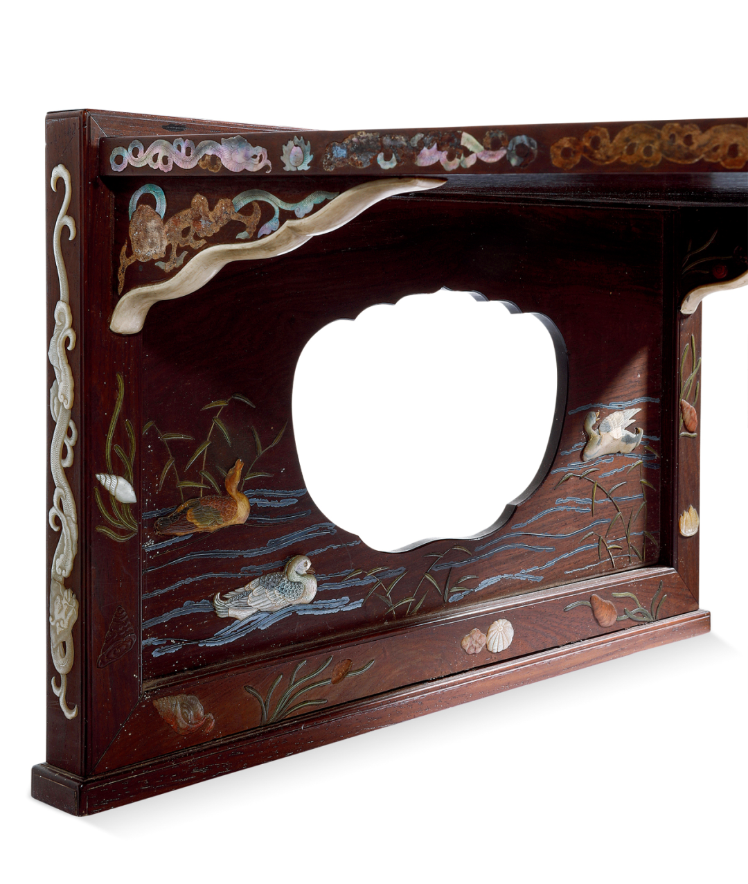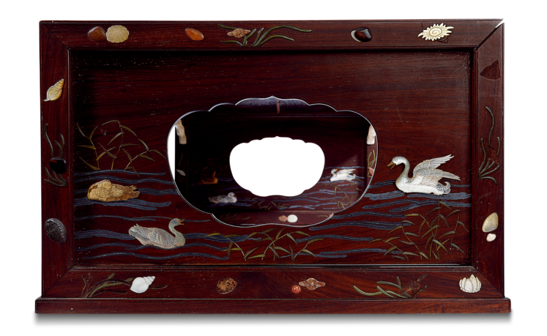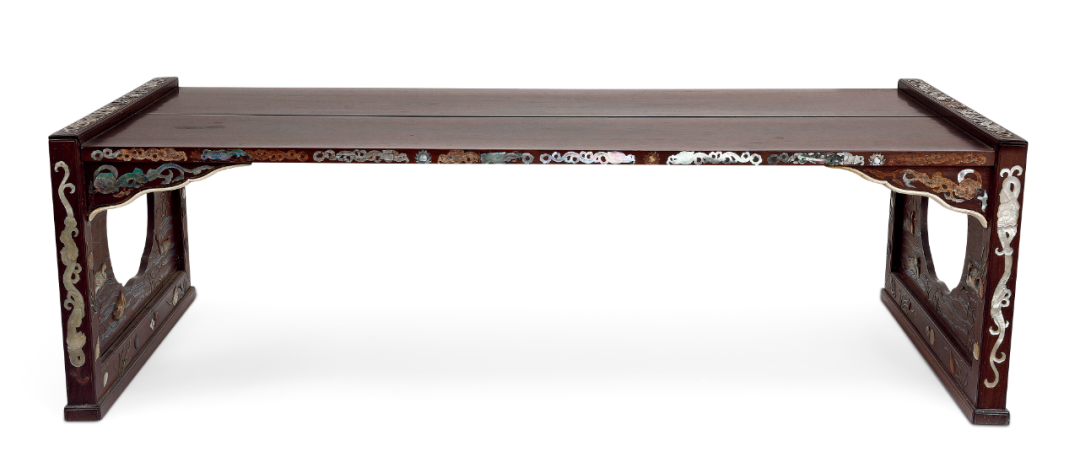 百宝嵌又名“周制”,起与明,盛于清,风靡天下。《遵生八笺》称:“如雕刻宝嵌紫檀等器,其费心思工本,为一代之绝。”钱泳《履园丛话》载:“周制之法,惟扬州有之。明末有周姓者,始创此法,故名周法。其法以金、银、宝石、真珠、珊瑚、碧玉、翡翠、水晶、玛瑙、玳瑁、车渠、青金、绿松、螺钿、象牙、密蜡、沉香为之,雕成山水、人物、树木、楼台、花卉、翎毛,嵌于檀、梨、漆器之上。大而屏风、桌、椅、窗槅、书架,小则笔床、茶具、砚匣、书箱,五色陆离,难以形容,真古来未有之奇玩也。乾隆中有王国琛、卢映之辈,精于此技。今映之孙葵生亦能之。”这件小几,以珍贵硬木制成,造型大方稳重,色泽古雅沉着,犹有明式家具遗风。正面以螺钿制成螭龙戏珠图案,华美气派,两侧挡板上用百宝镶嵌成秋水芦雁及水草螺贝,极富野趣。芦雁是传统的文人画题材,宋代黄庭坚即有《戏题大年防御芦雁》诗:“挥毫不作小池塘,芦荻江村落雁行。虽有珠帘藏翡翠,不忘烟雨罩鸳鸯。”清代边寿民以画芦雁着称,号为“边芦雁”。这件清康熙硬木百宝嵌芦雁螭龙纹几,选料上乘,构思、做工皆精巧不俗,既有皇家气派,又不失田园雅趣。