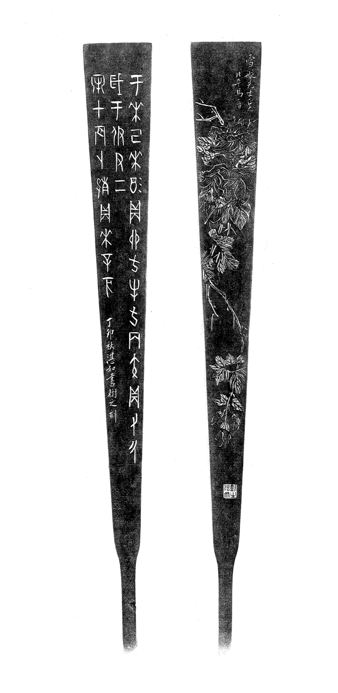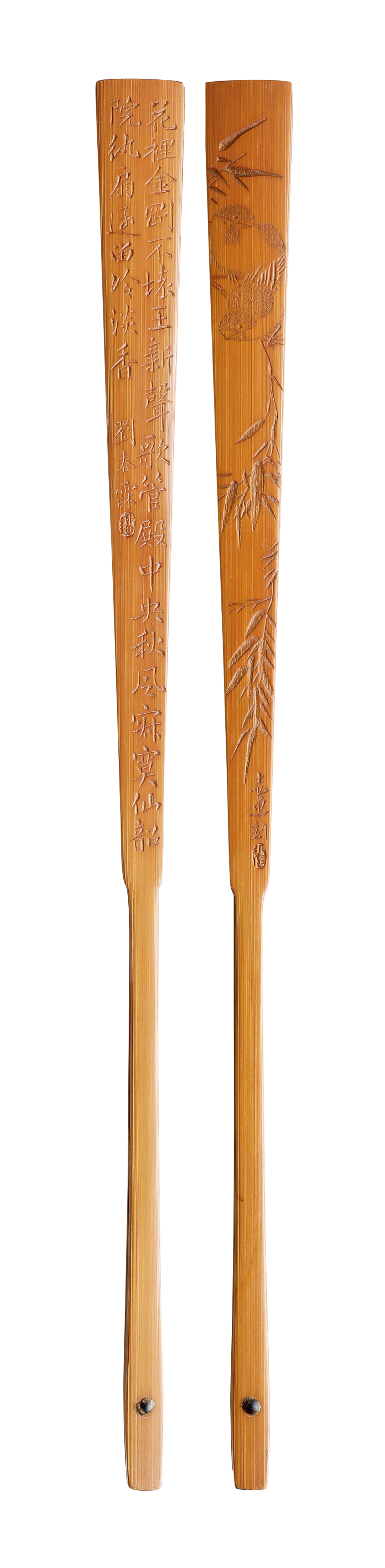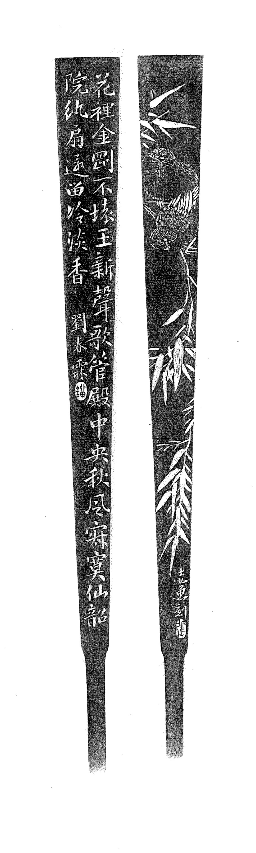 花里金刚不坏王,新声歌管殿中央。秋风寂寞仙韶院,执扇还留冷淡香。刘春霖,瑠(朱文)。张志鱼(1891-1963),或作张志愚,字通玄,又字瘦梅,亦署寿眉,别号斯庵生,河北宛平(今北京)人。1943年后寄居上海。篆刻家、竹刻家,北平艺术学院竹刻治印教授。工书画,精篆刻,擅刻竹,尤擅扇骨。所刻扇骨,必请名贤书画为稿,以双刀深刻皮雕、沙地留青技法独步当时,与南方不尽相同。著有《刻竹治印无师自通》、《扇骨拓集》和《寄斯庵印谱》。刘春霖(1872-1944),字润琴,号石云。中国晚清直隶省河间府肃宁县人,清德宗光绪三十年(1904)甲辰科状元,是中国历史上最后一名状元。善书法,尤以小楷为着。笔力清秀刚劲,深得世人推崇。时有「大楷学颜(颜真卿),小楷学刘(刘春霖)」之誉。