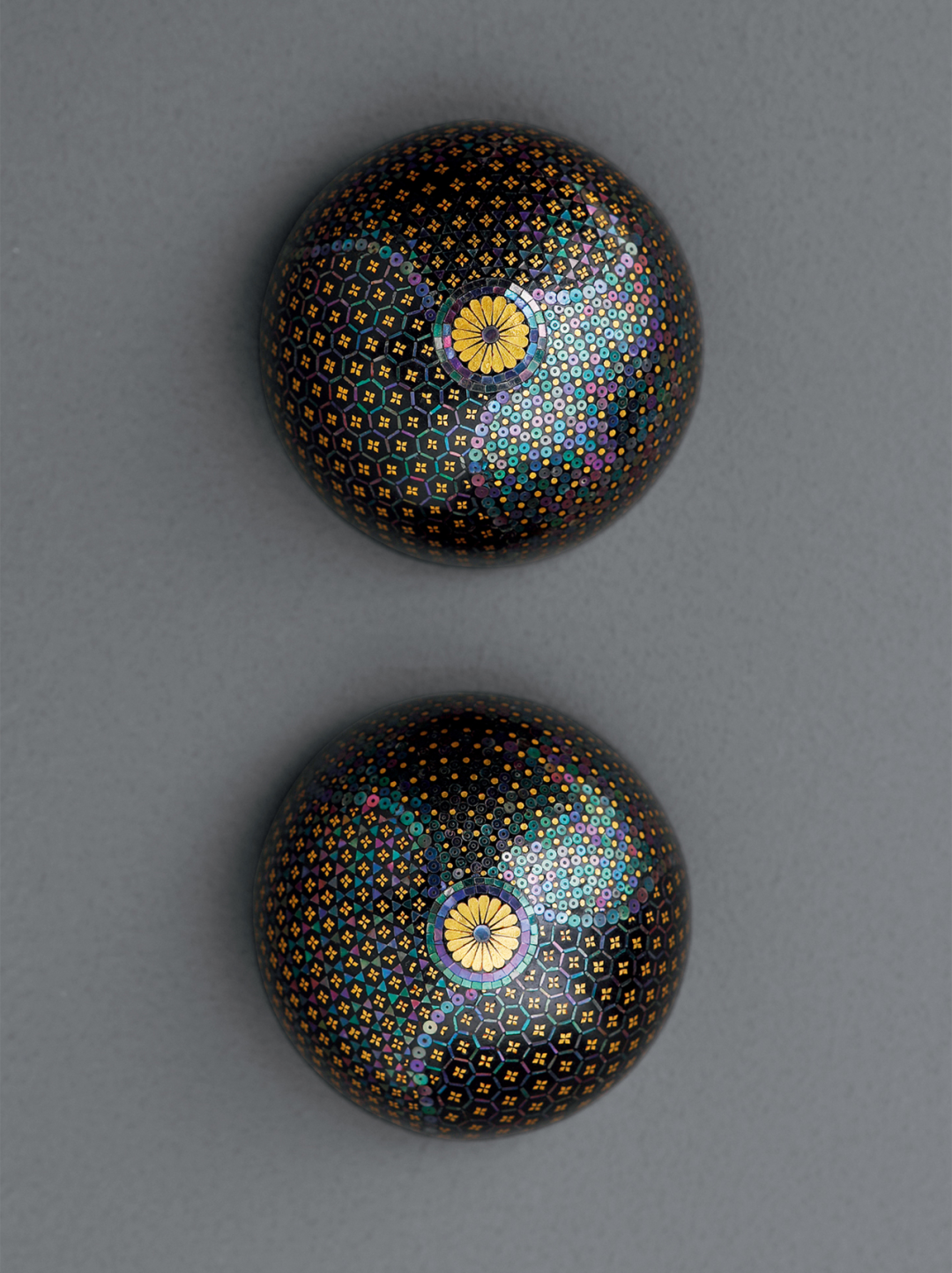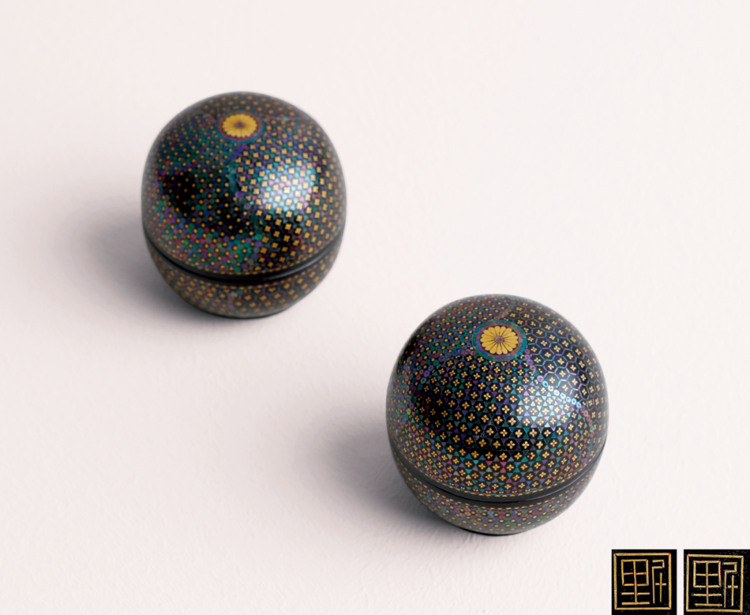 漆器镶嵌工艺是中国古代漆工艺中的重要组成部分之一,它包括嵌松石、螺钿、牙骨、竹、玉、银、铜、百宝嵌等。这件明末清初的黑漆嵌螺钿细锦地纹香盒,木胎黑漆,圆形,盒身上下均装饰细锦地纹,堆漆甚厚,晶莹照人,刻工圆润,准确细腻。器身通体嵌薄螺钿,螺钿本身泛出蓝、绿色美丽的光泽,优美大方,光彩照人,盒身间或点缀金箔片,愈加富丽堂皇。该盒纹饰布局十分考究,以盒盖顶部的花瓣图案为中心,采用四分法对称排列锦地纹饰,精致典雅,用于文房陈设,赏玩具佳,韵味独特。